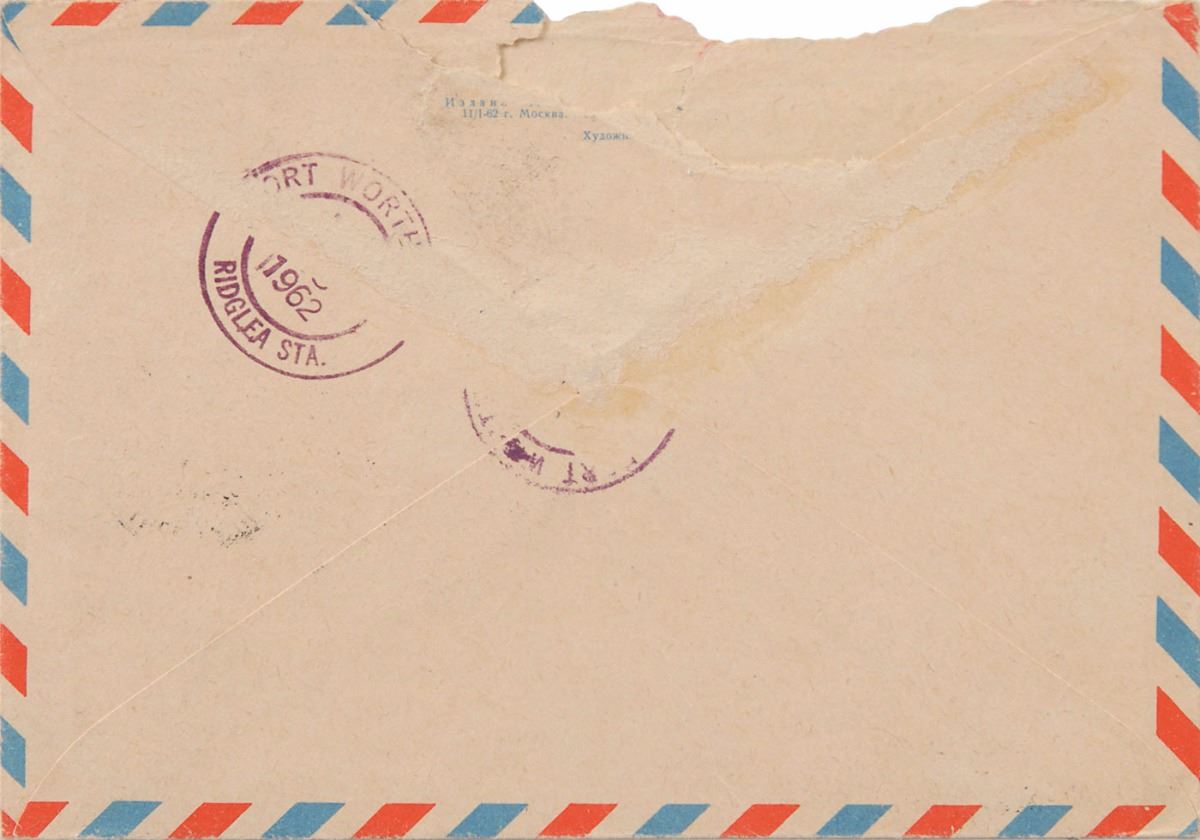 Hand-addressed airmail envelope, 6.25 x 4.25, addressed in Oswald’s hand to his brother, “USA, 7313 Davenport St., Fort Worth, Texas, Mr. R. Oswald,” adding his return address in Russian in the lower right, concluding with his name in Cyrillic, “A. Oswald.” Envelope bears several Russian postmarks and a ballpoint date notation of May 22, 1962. In very good to fine condition, with a torn top edge. During this time, after months of frustration, Oswald was finally succeeding in acquiring the paperwork required to return home to the United States. He, Marina, and their newborn daughter would return to the Dallas–Fort Worth area in June.