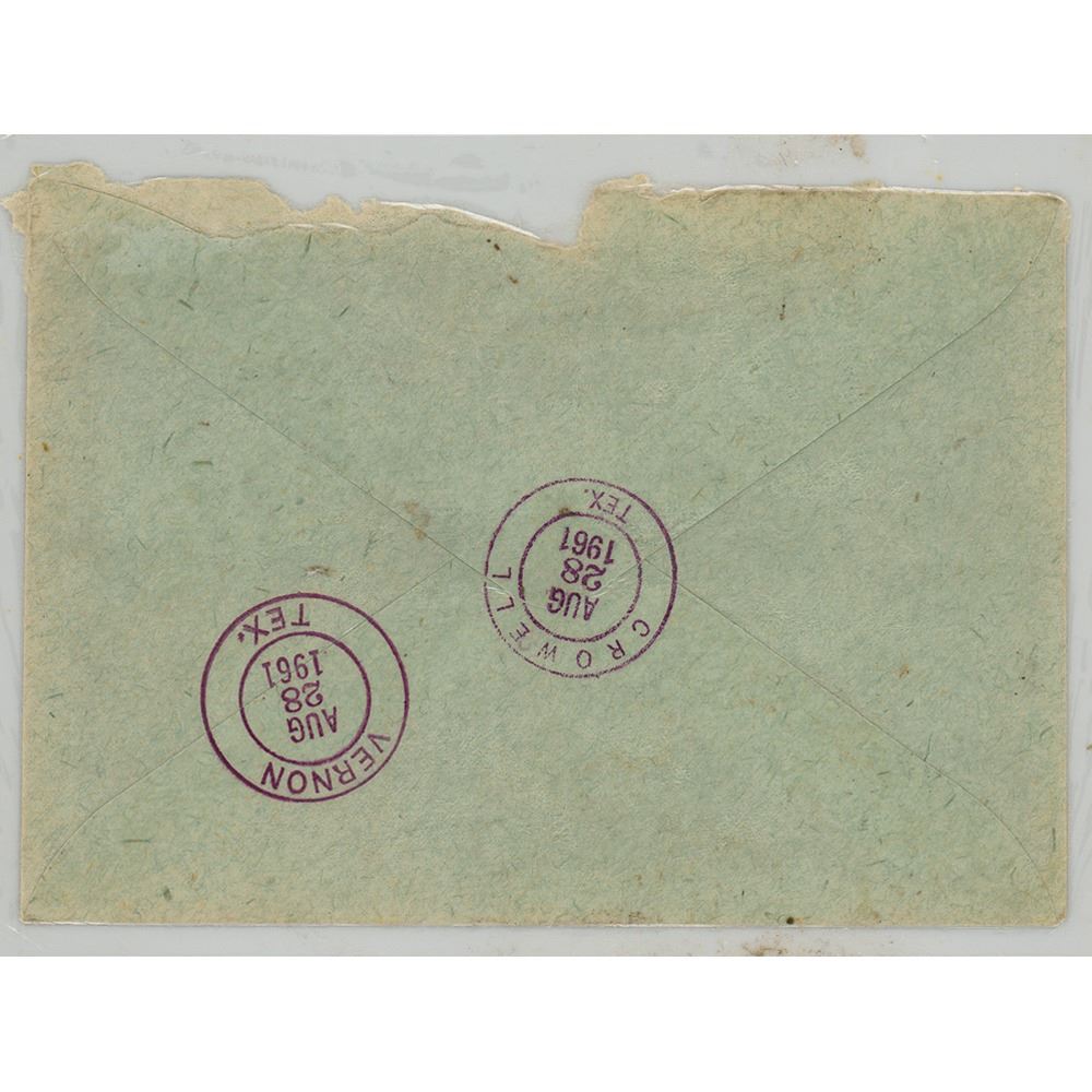 Hand-addressed airmail envelope, 6.25 x 4.25, addressed by Lee Harvey Oswald to his mother, "U.S.A., Mrs. M. Oswald, 1808 Eagle, Vernon, TX," adding his Minsk return address and name in Russian to the lower left. The envelope bears Russian postmarks on the front, and two August 28, 1961, postmarks from Vernon and Crowell, Texas, on the reverse. The envelope bears soft lamination, consistent with other official exhibits that were in the government's possession during the Warren Commission investigation. In fine condition.