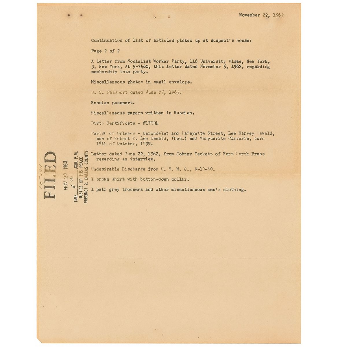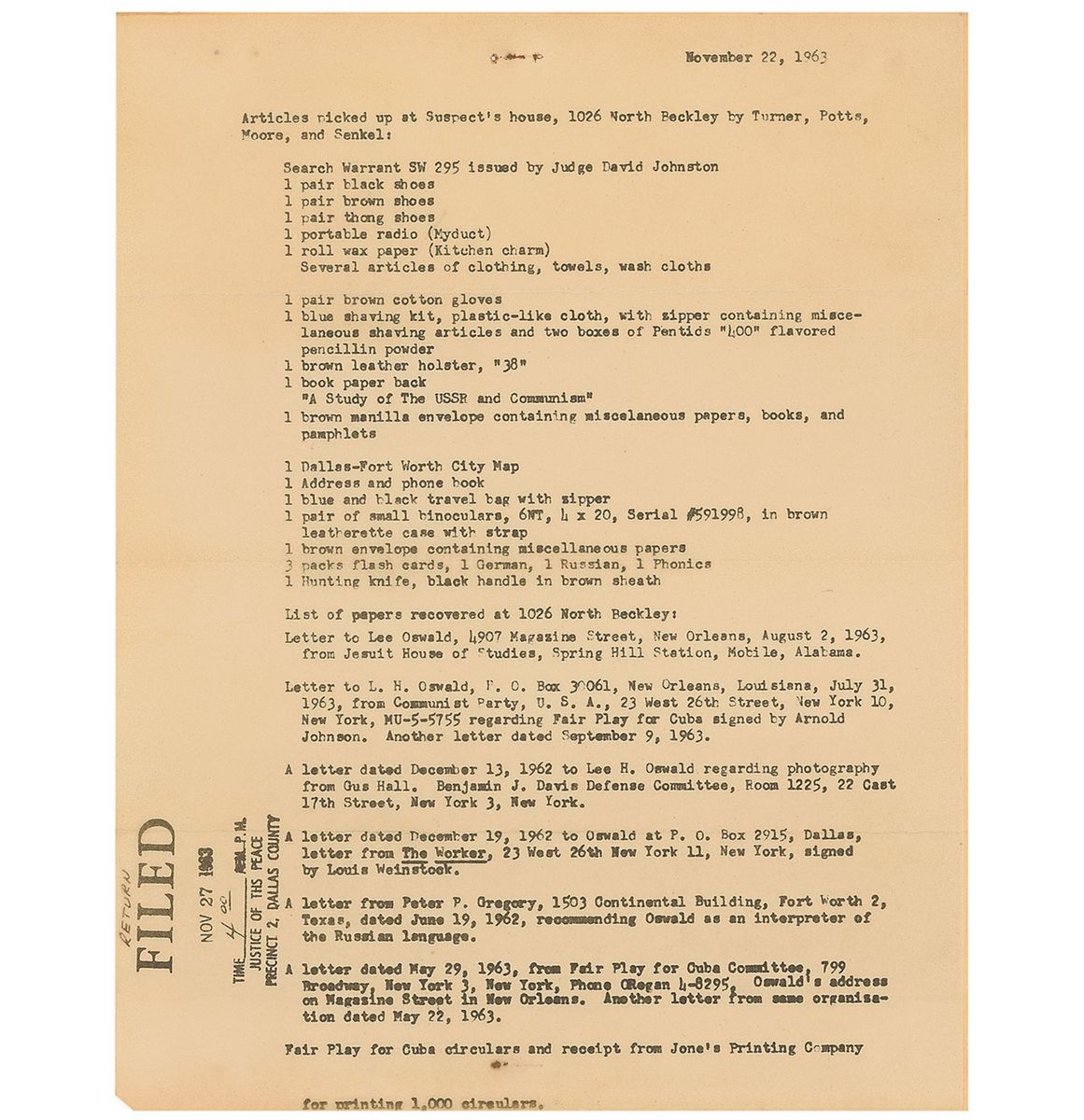 Official copy of a typed list of items confiscated from Oswald’s house at 1026 North Beckley Avenue in Dallas, two pages, 8.5 x 11, November 22, 1963. Confiscated articles included “1 brown leather holster, ‘38,’” “1 book paper back ‘A Study of The USSR and Communism,’” “1 Dallas-Forth Worth City Map,” “1 pair of small binoculars, 6NT 4 x 20, Serial #591998, in brown leatherette case with strap,” and “1 Hunting knife, black handle in brown sheath.” Papers recovered included “Letter to L. H. Oswald…regarding Fair Play for Cuba signed by Arnold Johnson,” “Letter from Peter P. Gregory…recommending Oswald as an interpreter of the Russian language,” “Fair Play for Cuba circulars and receipt from Jone’s Printing Company for printing 1,000 circulars,” “A letter from Socialist Worker Party…regarding membership into party,” “U. S. Passport dated June 25, 1963,” “Russian passport,” and “Undesirable Discharge from U. S. M. C., 9-13-60.” In fine condition, with staple holes to top.