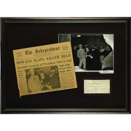 <B>Lee Harvey Oswald Signed Document.</B></I> A savings withdrawal slip from the Bank of America, 6.25" x 3.25", April 23, 1957, filled out in his hand and signed "<I>Lee H Oswald</B></I>". The slip is presented in a montage along with an oversized photograph, 13.25" x 10" (sight), of the famous scene of Jack Ruby shooting Oswald while in custody in Dallas, signed by the photographer <B>Bob Jackson</B></I>; and a front page of "<I>The Independent</B></I>" issue, Pasadena, Ca., Nov. 25, 1963, showing the same photo and announcing Oswald's shooting. The montage is matted in leather and framed to an overall size of 32.5" x 24.5".<BR><BR><b>Shipping:</b> Framed - with Glass, Large (<a target="_blank" href="http://www.heritageauctions.com/common/shipping.php">view shipping information</a>)