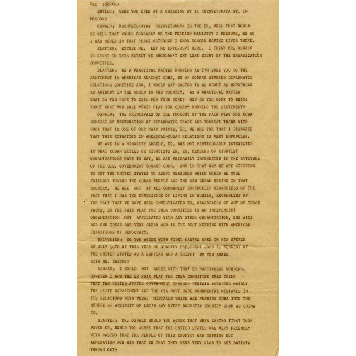 Teletype of an interview with Lee Harvey Oswald in his role as Secretary of the Fair Play for Cuba Committee. Taped on 17 August 1963 with reporter Bill Slatter and Bill Stuckey, just three months before Oswald killed the President. In response to a question whether he would agree with Castro's opinion of Kennedy as a ''ruffian and a thief,'' Oswald replies, ''I would not agree with that er particular wording.'' Single page measures 8.5'' x 14.5''. Type has lightened, though still very readable. From the Robert L. White JFK collection.