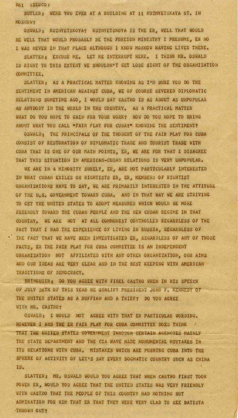 Teletype of an interview with Lee Harvey Oswald in his role as Secretary of the Fair Play for Cuba Committee. Taped on 17 August 1963 with reporter Bill Slatter and Bill Stuckey, just three months before Oswald killed the President. In response to a question whether he would agree with Castro's opinion of Kennedy as a ''ruffian and a thief,'' Oswald replies, ''I would not agree with that er particular wording.'' Single-page measures 8.5'' x 14.5''. Type has lightened, though still very readable. From the Robert L. White JFK collection.