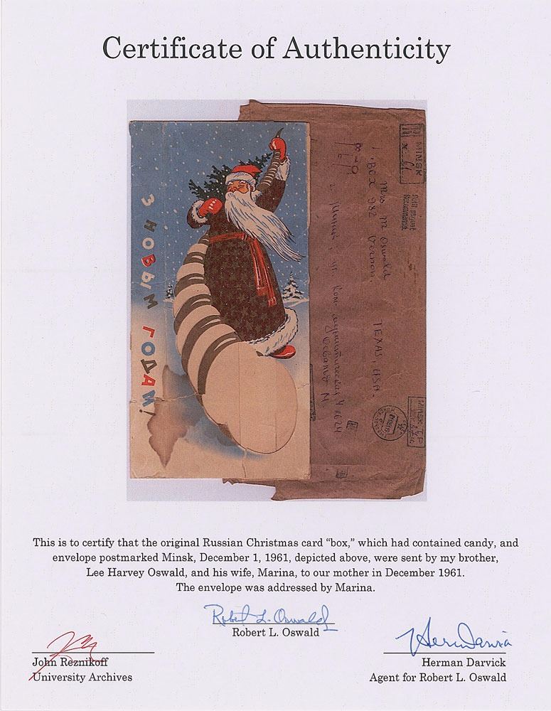 Original Russian Christmas candy box that Oswald sent home to his mother, flattened to 5 x 10, featuring an image of Santa with a die-cut cornucopia below (presumably to display the candy it once contained). Includes a portion of the original mailing envelope postmarked Minsk, December 1, 1961, addressed in Marina Oswald’s hand. In very good condition, with a few significant tears to lower portion of the box, and a stain to the lower left. Accompanied by a letter of authenticity from his older brother, Robert L. Oswald. In her testimony before the Warren Commission, Marguerite mentioned this present: ‘Lee and Marina had sent me wonderful gifts, and I have the gifts, from Russia. A box of tea, very fine tea, a Russian scarf, pure linen napkins, embroidered with my initial, a box of candy for Christmas that has a Russian Santa Claus on it.’ A rare item directly related to Oswald’s life in the Soviet Union as well as the Warren Commission investigation.