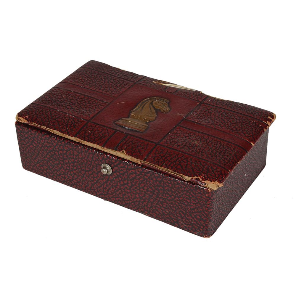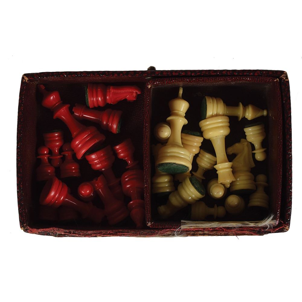 Vintage chess set given to Lee Harvey Oswald by his mother after the family had moved to New Orleans in 1954, consisting of 14 white plastic pieces—one king, one queen, one bishop, two rooks, two knights, and seven pawns—and 14 red plastic pieces—one king, one queen, one knight, two bishops, two rooks, and seven pawns. Housed in the original burgundy leather box, 6.75 x 2.25 x 4, with an embossed gold image of a knight piece on the lid. In very good to fine condition, with moderate wear to the box and lid (which is detached but present); the chessmen themselves are in fine condition. When Marguerite Oswald was summoned to testify before the President's Commission on the assassination of President Kennedy on February 12, 1964, a portion of her testimony related to the various childhood hobbies of her son: "Lee played Monopoly. Lee played chess. Lee had a stamp collection, and even wrote to other young men and exchanged stamps, sir. And Lee read history books, books too deep for a child his age."