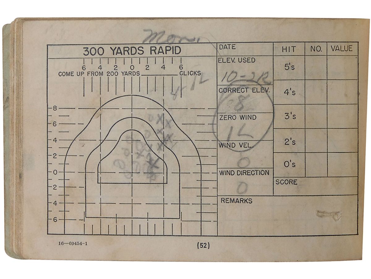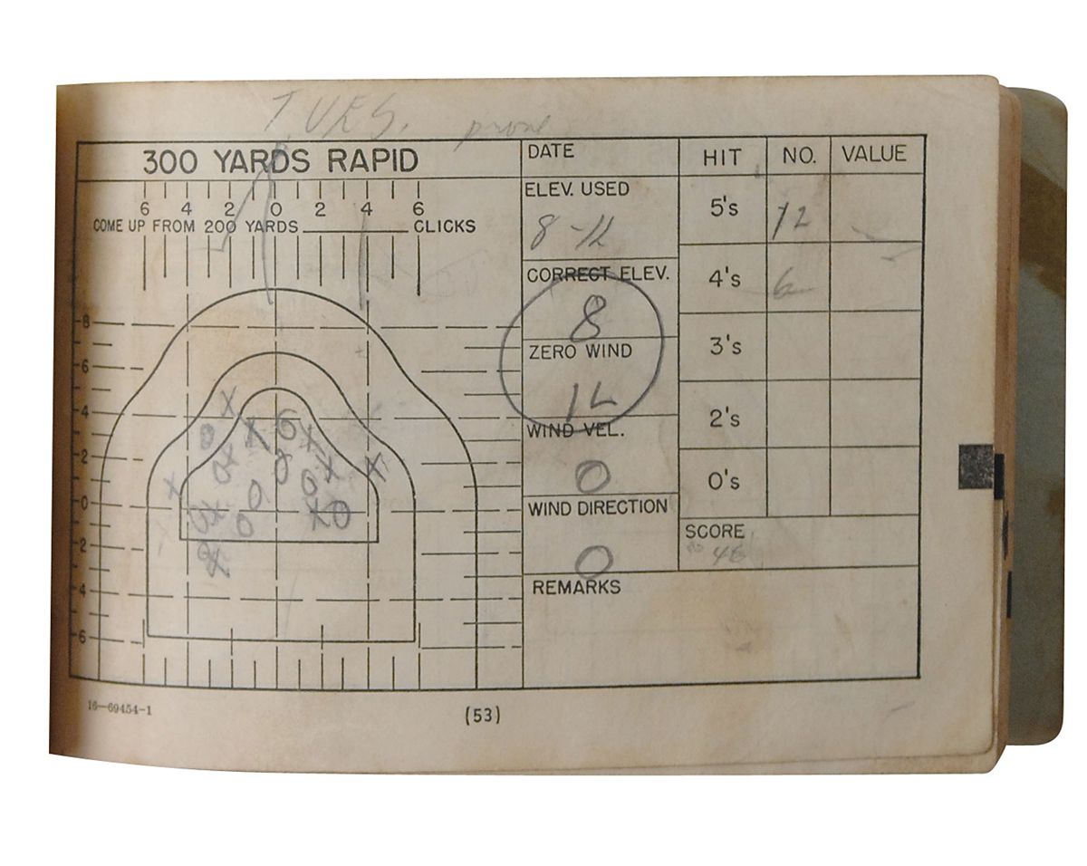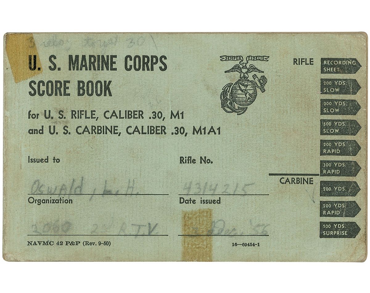 Oswald’s personally-owned and -used softcover workbook entitled “U. S. Marine Corps Score Book for U. S. Rifle, Caliber .30, M1 and U. S. Carbine, Caliber .30, M1A1,” 80 pages, 6 x 3.75, filled out by Oswald on the front cover in pencil with his name, “Oswald, L. H.,” rifle number, “4314215,” organization, “2060 2nd R.T.V.,” and date issued, “3 Dec. ’56.” The first few pages contain instructions for shooting and scorekeeping, and bear a couple pencil notations by Oswald in the margins. The majority of the book consists of target diagrams and tables filled out in pencil by Oswald, plotting his shots on the diagrams and recording relevant details like date, elevation, and wind speed/direction. Oswald also generally indicates his firing position in the upper margin, such as “kneeling,” “sitting,” or “prone.” In total, Oswald completed 32 such pages throughout the month of December, with two being practice ‘samples’ and the rest his actual results. In very good to fine condition, with two toned tape remnants affixed to the front cover, light general soiling, and three small areas of surface loss to the back cover. Accompanied by interesting correspondence from 1969 between Marguerite Oswald and John Lattimer, a notable researcher of the Kennedy assassination, who originally purchased the score book from her; this includes one ALS from Marguerite, in part: “My late son’s Marine score book is in the same condition as when he left it with me…Someday soon it will be proven that a conspiracy did exist and that my son was indeed the ‘patsy.’”