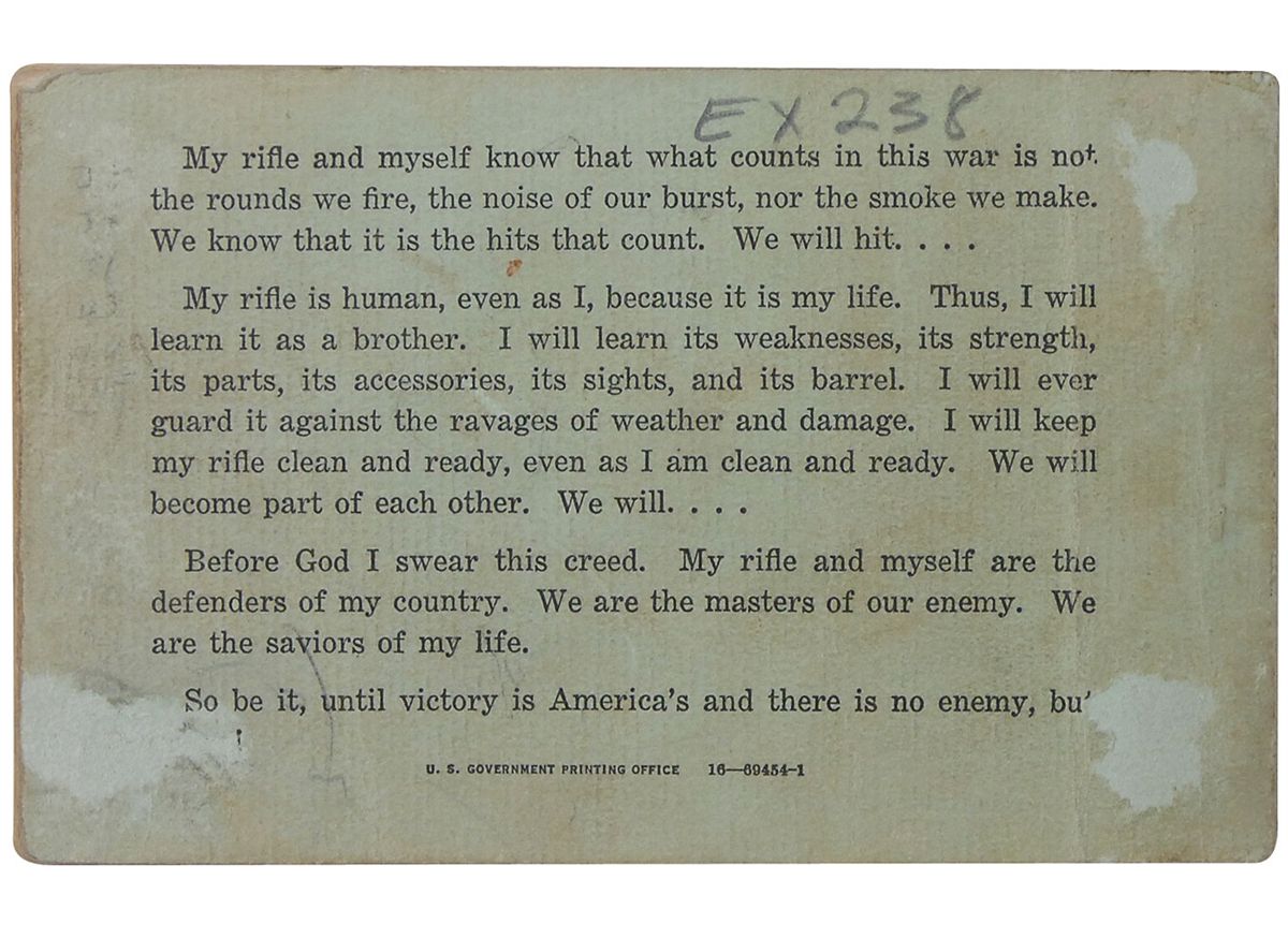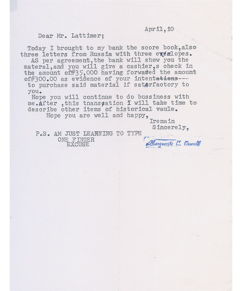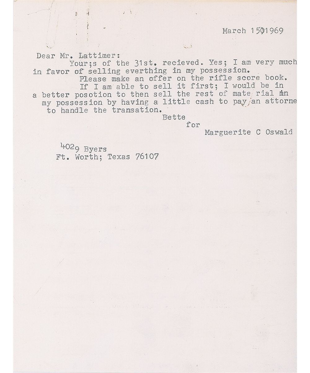 Oswald’s personally-owned and -used softcover workbook entitled “U. S. Marine Corps Score Book for U. S. Rifle, Caliber .30, M1 and U. S. Carbine, Caliber .30, M1A1,” 80 pages, 6 x 3.75, filled out by Oswald on the front cover in pencil with his name, “Oswald, L. H.,” rifle number, “4314215,” organization, “2060 2nd R.T.V.,” and date issued, “3 Dec. ’56.” The first few pages contain instructions for shooting and scorekeeping, and bear a couple pencil notations by Oswald in the margins. The majority of the book consists of target diagrams and tables filled out in pencil by Oswald, plotting his shots on the diagrams and recording relevant details like date, elevation, and wind speed/direction. Oswald also generally indicates his firing position in the upper margin, such as “kneeling,” “sitting,” or “prone.” In total, Oswald completed 32 such pages throughout the month of December, with two being practice ‘samples’ and the rest his actual results. In very good to fine condition, with two toned tape remnants affixed to the front cover, light general soiling, and three small areas of surface loss to the back cover. Accompanied by interesting correspondence from 1969 between Marguerite Oswald and John Lattimer, a notable researcher of the Kennedy assassination, who originally purchased the score book from her; this includes one ALS from Marguerite, in part: “My late son’s Marine score book is in the same condition as when he left it with me…Someday soon it will be proven that a conspiracy did exist and that my son was indeed the ‘patsy.’”