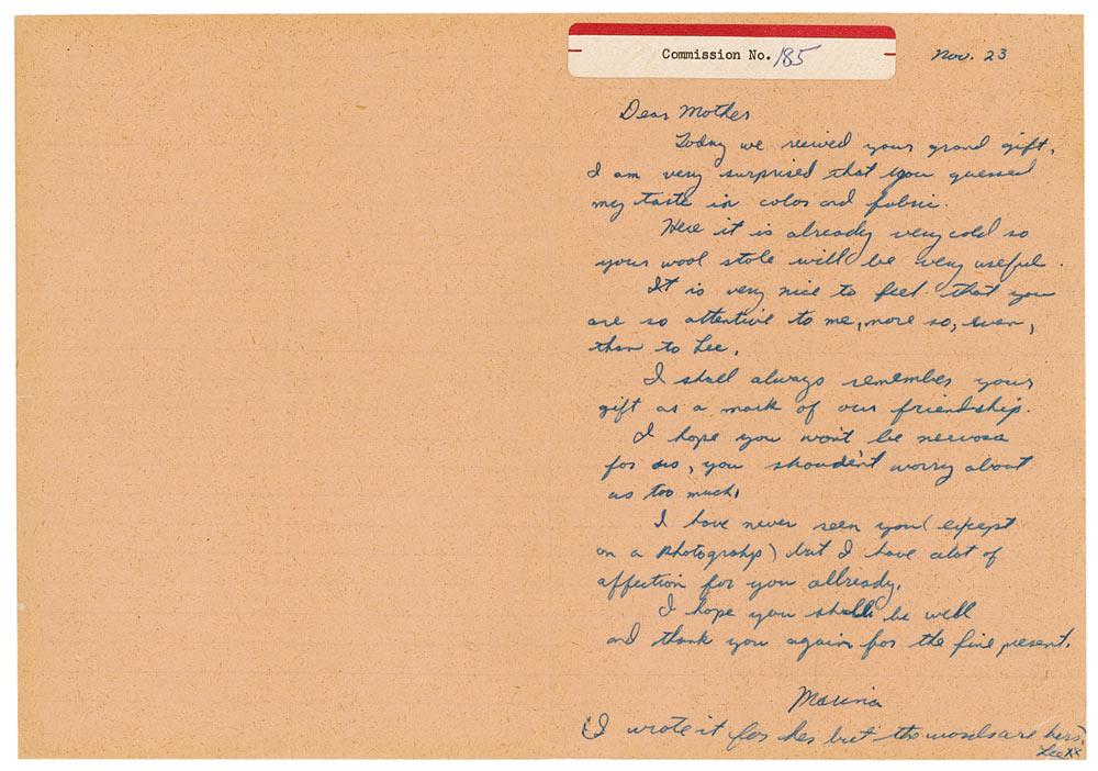 ALS, one page, lightly-lined, 5.5 x 8, November 23. Letter written in Oswald’s hand for his wife to his mother. Signed by Oswald on her behalf, “Marina,” and signed again by Oswald at the conclusion of a short postscript, “Lee xx.” In full: “Today we received your grand gift, I am very surprised that you guessed my taste in color and fabric. Here it is already very cold so your wool stole will be very useful. It is very nice to feel that you are so attentive to me, more so, even, than to Lee. I shall always remember your gift as a mark of our friendship. I hope you won’t be nervous for us, you shouldn’t worry about us too much. I have never seen you (except on a photograhp [sic]) but I have a lot of affection for you allready [sic]. I hope you shall be well and thank you again for the fine present.” At the bottom Oswald writes, “(I wrote it for her but the words are hers) Lee xx.” This letter was an official exhibit (No. 185) in the Warren Commission investigation into JFK’s assassination and, like most of the exhibits, is protectively and permanently soft-laminated. In fine condition.