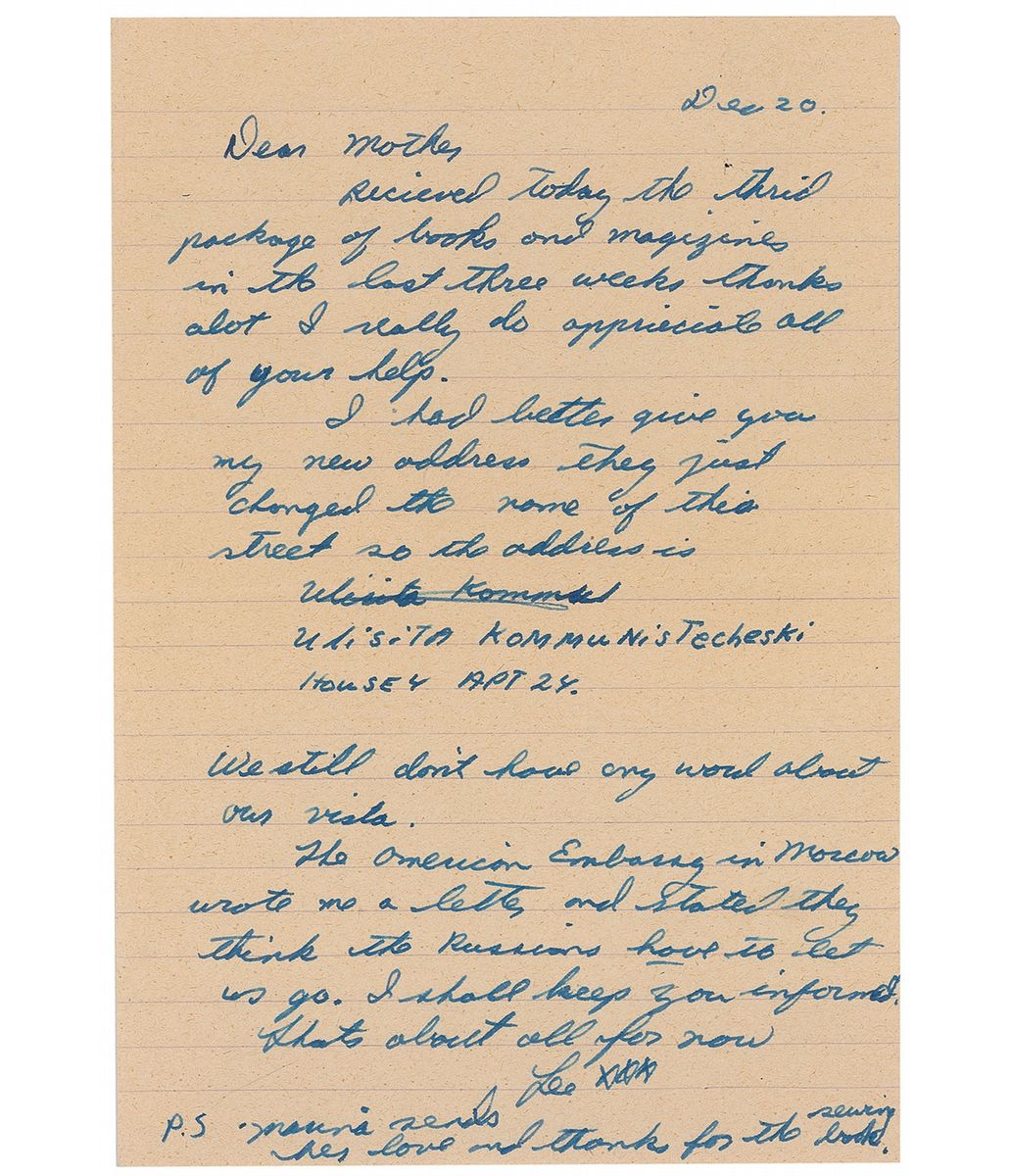 ALS signed “Lee xxx,” one page, lightly-lined, 5.5 x 8, December 20, [1961]. Letter to his mother. In full (with grammar and spelling retained): “Recieved today the thrid package of books and magazines in the last three weeks thanks a lot I really do apprieciate all of your help. I had better give you my new address they just changed the name of this street so the address is Ulisita Kommset Ulisita Kommunidstecheski House 4 Apt 24. We still don’t have any word about our vista [visa]. The American Embassy in Moscow wrote me a letter and stated they think the Russians have to let us go. I shall keep you informed. That’s about all for now.” His short postscript reads: “Marina sends her love and thanks for the sewing book.” Pencilled along the lower edge of reverse by John Lattimer is “JKL 92 68”; Lattimer was selected by the Kennedy family to be the first non-governmental medical specialist to review evidence in the assassination, ultimately supporting the findings of the Warren Commission. In fine condition, with a uniform shade of mild toning.