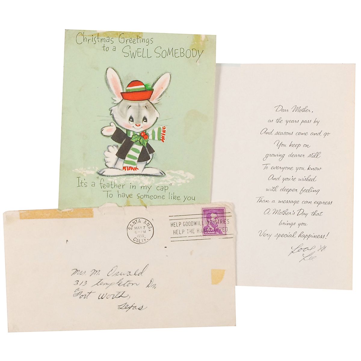 Mother’s Day card from 1959, signed “Love Lee xx,” sent to Marguerite Oswald, 3.75 x 7 closed, with a pre-printed sentiment inside, and signed at the bottom in black ballpoint by Oswald. Reverse is also notated “Ex 266,” indicating this was an exhibit in the Warren Commission report, although it was unpublished. Card comes with its original mailing envelope, postmarked May 7, 1959, addressed by Oswald to, “Mrs. M. Oswald, 313 Templeton Dr., Fort Worth, Texas.” On the reverse, Mrs. Oswald has written several notations, including, “Hon. Herter, U.S. State Dept. Wash, DC,” “Hon. Jim Wright, Congressman 12th Dist. House affair building,” and “Hon. Lyndon Johnston [sic], U.S. Senator Washington D. C.,” written in another hand.