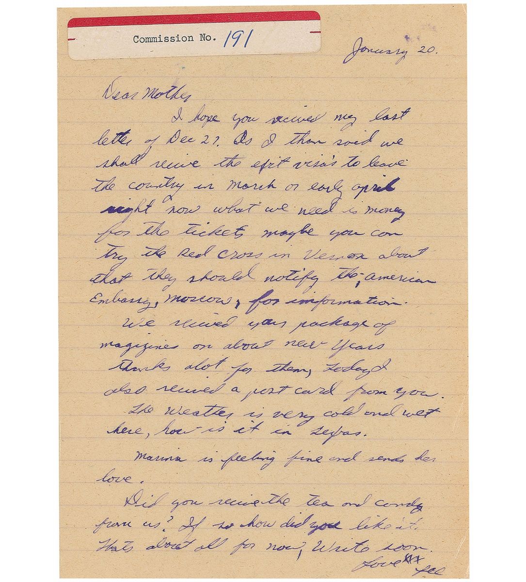 ALS signed “xxx Lee,” one lightly-lined page, 5.75 x 8, January 20, [1962]. Letter to his mother, Marguerite. In full (spelling and grammar retained): “I hope you received my last letter of Dec. 27. As I than said we shall recive the exit visas to leave the country in march or early April. Right now what we need is money for the tickets maybe you can try the Red Cross in Vernon about that they should notify the American Embassy, Moscow, for information. We received your package of magazines on about New Years thanks a lot for them, Today I also received a post card from you. The weather is very cold and wet here, how is it in Texas. Marina is feeling fine and sends her love. Did you recive the tea and candy from us? If so how did you like it. That’s all for now. Write soon.” This letter was an official exhibit (No. 191) in the Warren Commission investigation into JFK’s assassination and, like most of the exhibits, is protectively soft-laminated. In fine condition, laminated as described, with a mild shade of toning and a few light creases.
