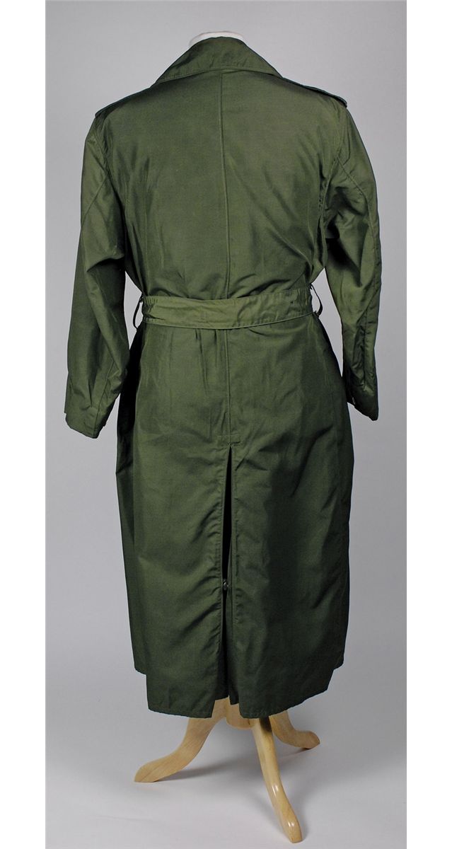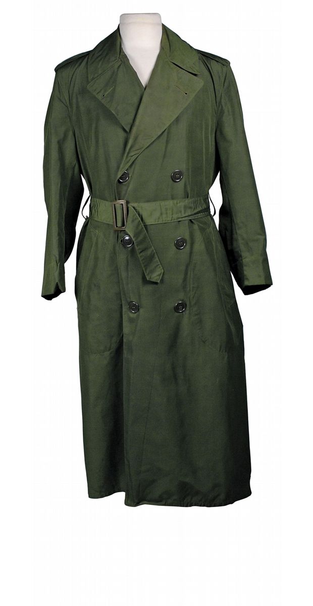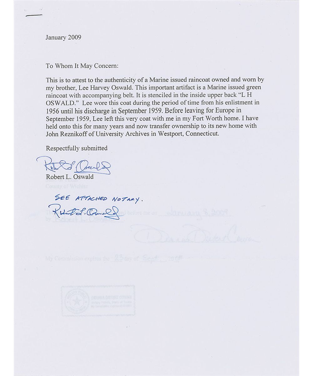 Oswald’s personally-owned and -worn long double-breasted raincoat issued by the United States Marine Corps, dark green, size 38R, stenciled inside the collar area, “L. H. Oswald.” His name is also stenciled inside the belt, which is included. In fine condition. Accompanied by a certificate of authenticity from University Archives and notarized letter from Robert L. Oswald, in part: “Lee wore this coat during the period of time from his enlistment in 1956 until his discharge in September 1959. Before leaving for Europe in September 1959, Lee left this very coat with me in my Fort Worth home.” An outstanding piece with impeccable provenance, this is the only clothing officially issued to Oswald we have offered.