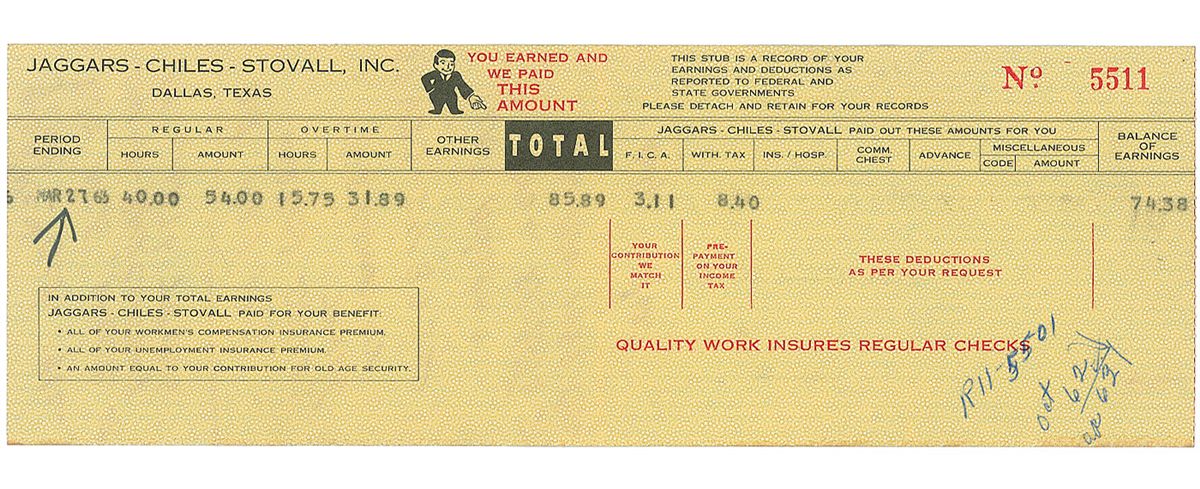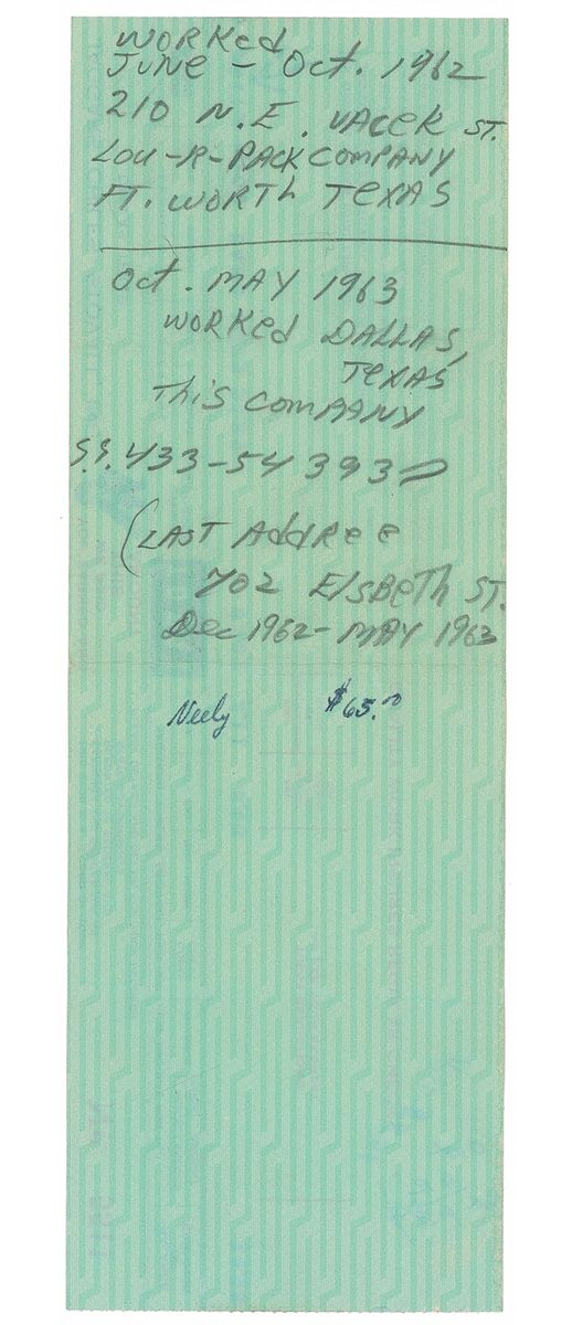 Handwritten list in pencil on the reverse of one of Oswald’s pay stubs from Jaggars-Chiles-Stovall, Inc., of Dallas, Texas, 10 x 3.25, for the pay period ending March 27, 1963. Oswald writes a resume-style list of all the companies that he worked for after returning to the United States from Moscow. In full: “Worked June–Oct. 1962, 210 N. E. Vacek St., Lou-R-Pack Company, Ft. Worth Texas / Oct–May 1963, Worked Dallas, Texas, This Company / S. S. 433-54 3937 / Last Addres / 702 Elsbeth St. / Dec 1962–May 1963.” An ink notation below reads, “Neely $65.00.” In 1963, Oswald lived at 214 West Neely in Dallas, his last Dallas address before moving to New Orleans in May; the Warren Report stated his monthly rent on Neely Street was $60. In fine condition, with three unobtrusive storage folds. Originates from a collection of family documents given by Marina Oswald to her personal attorney.