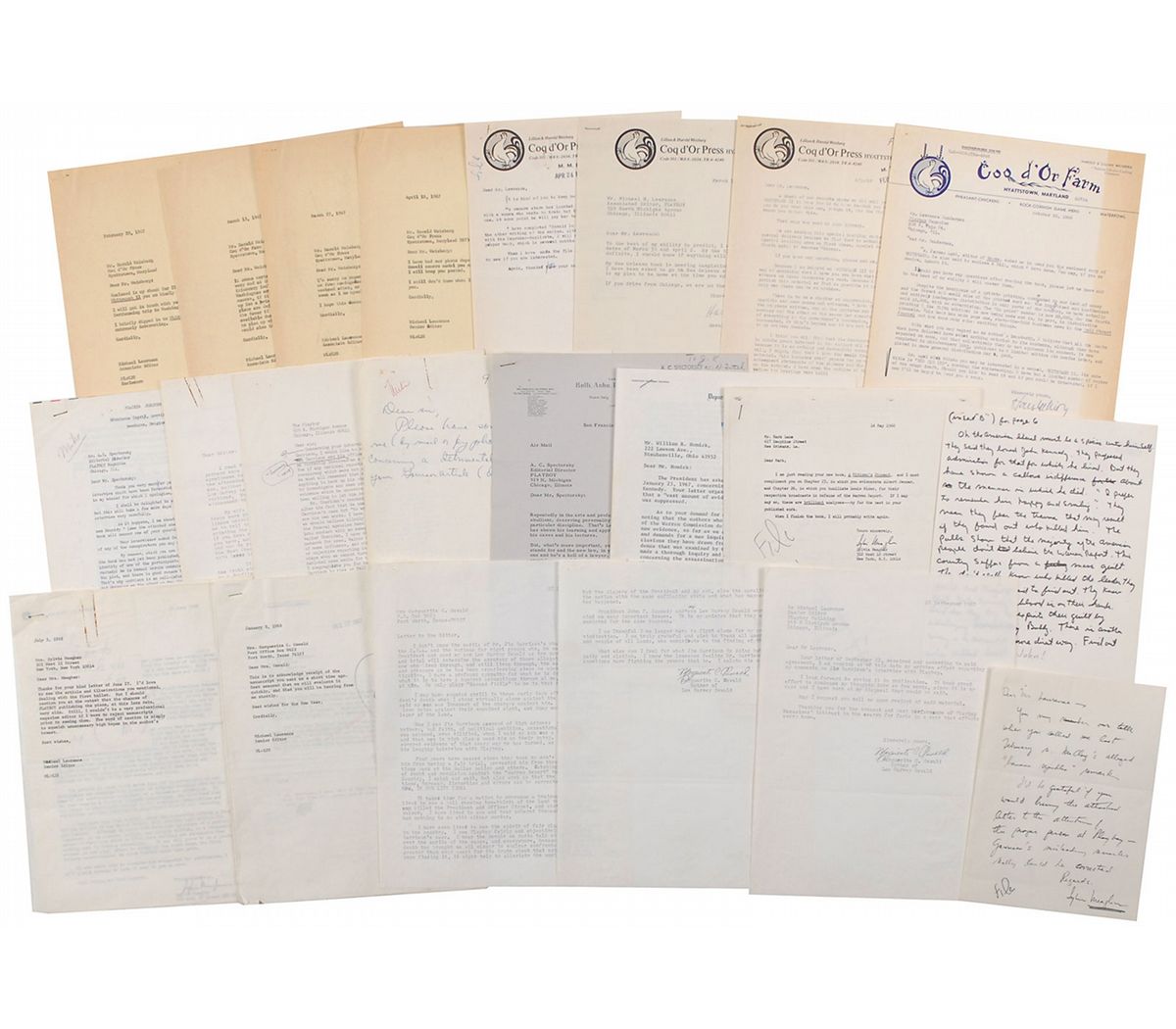 Other material, most sent to Laurence or other Playboy editors, includes: five pages of carbon copies of Laurence's correspondence with Oswald, discussing her article and negotiating terms of payment; an ALS and TLS from Sylvia Meagher, discussing "Garrison's misleading remarks" and recommending an article that discredits the "single bullet theory and therefore the lone-assassin hypothesis," with carbon copies of Laurence's response; four TLSs from Harold Weisberg discussing his "Whitewash" series of books investigating the assassination, with carbon copies of Laurence's replies; TLS from conspiracy researcher Joachim Joesten discussing the interview with Garrison, in part: "Not only has Garrison discovered the identity of one of the participants in the shooting, but he has that man in custody! He is Manuel Garcia Gonzalez, one of the Cuban CIA agents involved"; an anonymous typed letter from a "timid (but still alive) eyewitness," regarding the shooting of J. D. Tippit after JFK's assassination, in part: "I saw two men, neither of them resembling the pictures I later saw of Lee Harvey Oswald, shoot Tippit and run off in opposite directions"; a TLS and an ANS from Perry R. Russo, one-time roommate of David Ferrie, regarding the interview with Garrison; TLS from Melvin M. Belli, Jack Ruby's lawyer, about fellow lawyer F. Lee Bailey; and a TLS signed by Martin F. Richman, who clerked for Earl Warren, about the validity of the Warren Commission's findings. In overall fine condition. A tremendous archive of period correspondence about Oswald and the assassination, with an abundance of rare ‘behind-the-scenes’ conspiracy-related content from some of the major players in the investigation of such alternative theories.