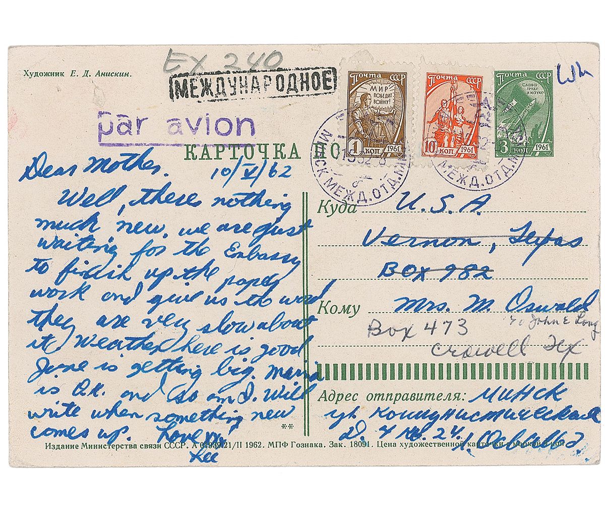ALS signed “Love xxx, Lee,” on a colorful 5.75 x 4.25 nuclear-themed May Day postcard, May 10, 1962. Postcard to his mother reads, in full (with grammar and spelling retained): “Well theres nothing much new, we are just waiting for the Embassy to finish up the paper work and give us the word they are very slow about it. weather here is good June is getting big, Marina is O.K and so am I. Will write when something new comes up.” Oswald has addressed the postcard to, “U.S.A. / Vernon, Texas / Mrs. M. Oswald,” with Lee writing his return address at the bottom, in Russian, and signed “A. Oswald.” In Russia he was “Alek.” The address has been lightly crossed out with a forwarding address written below in another hand. Correspondence side is also labeled in pencil, “EX 240,” for Warren Commission Exhibit No. 240. In fine condition.