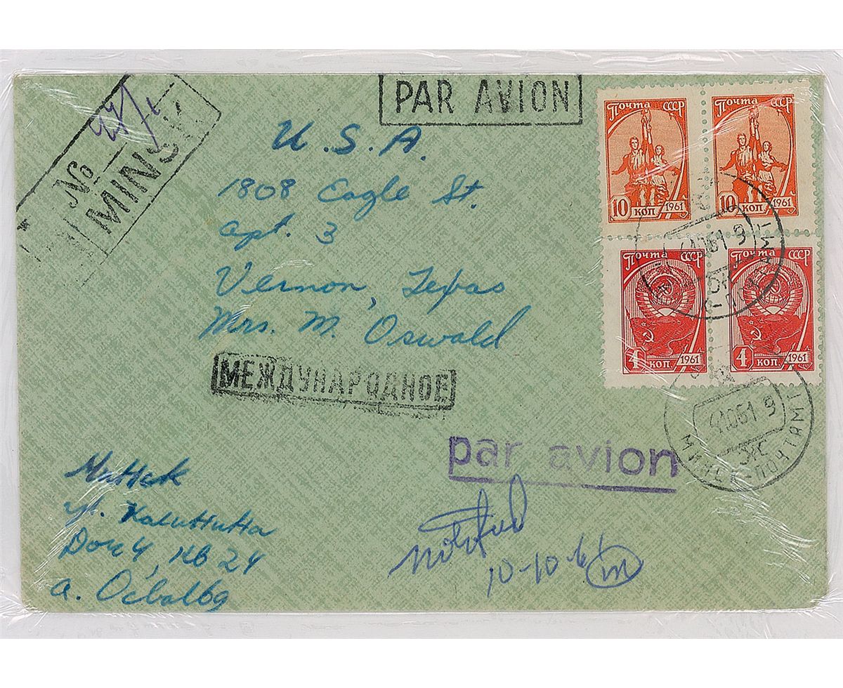 Hand-addressed airmail envelope, 5.5 x 3.5, addressed in Oswald’s hand to his mother, “U. S. A., 1808 Eagle St., Apt. 3, Vernon, Texas, Mrs. M. Oswald,” and adding his Moscow return address in Russian including his name, “Minsk, ul. Kalinina, House 4, Apt. 24, A. Oswald.” Envelope bears four affixed Soviet stamps and postmarked Minsk, October 4, 1961. This was part of Warren Commission Exhibit No. 182, and is thinly laminated as is typical. In fine condition. Provenance: Collection of Dr. John K. Lattimer. During this period, Oswald was struggling to secure the correct paperwork to leave the USSR and return to the United States, and growing increasingly frustrated with the bureaucratic red tape he continued to encounter. While in Russia, Lee Harvey Oswald was known as ‘Alek.’