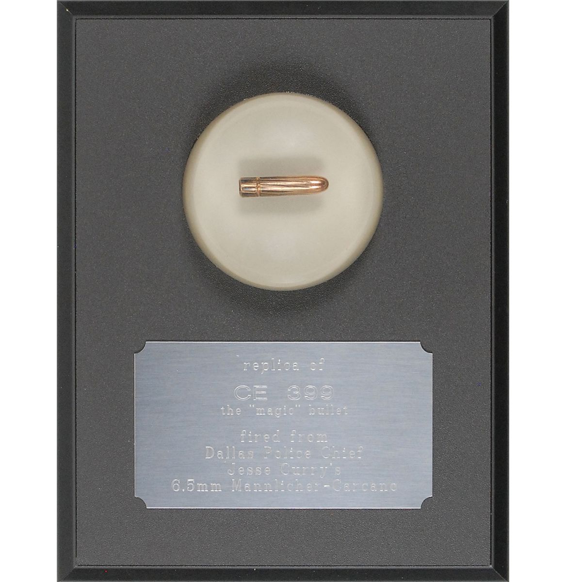 A bullet, approximately 1.25? long, fired from a 6.5mm Mannlicher-Carcano Italian carbine rifle owned by Jesse E. Curry, Dallas Chief of Police from 1960–1966. He was seated in the lead car in the presidential motorcade on November 22, 1963. A similar bullet from a similar rifle was shot by Lee Harvey Oswald at President Kennedy. Warren Commission Exhibit 399 is identified as ‘Bullet found on stretcher at Parkland Memorial Hospital, Dallas, Tex.’ It is also pictured on page 49 of Volume XVII of the Warren Commission Hearings. Bullet is housed in an acrylic mold, 3” in diameter, and mounted on a 7 x 9 plaque, with a descriptive plate affixed to the bottom which reads, “Replica of CE 399 the ‘magic’ bullet fired from Dallas Police Chief Jesse Curry’s 6.5mm Mannlicher-Carcano.” Accompanied by a copy of a 1991 notarized letter from Larry N. Howard, co-director, JFK Assassination Information Center, which reads: “I Larry Howard, set in place this 6.5mm bullet in an acrylic mold after firing it myself from Dallas Police Chief Jesse Curry’s personal 6.5mm Italian Mannlicher-Carcano rifle. I originally made 5 examples but only 3 were successful. In turn I sold one of the successful examples to Stanley J. Szerszen.” In fine condition. An incredibly scarce, and still controversial reminder of that day in Dallas.