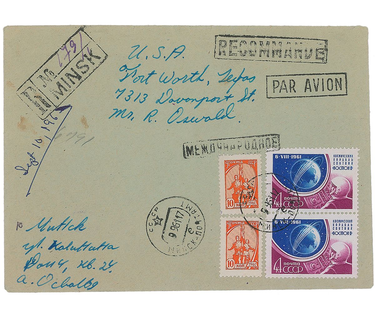 Air mail envelope, 6 x 4.5, addressed in Oswald’s hand to his brother, “U. S. A., Fort Worth, Texas, 7313 Davenport St., Mr. R. Oswald,” and adding his Moscow return address in Russian, including his name, “A. Oswald,” also in Russian, at the bottom. Envelope bears two September 9, 1961, Russian postmarks on the front, and two Texas postmarks on the reverse. This envelope was part of Warren Commission Exhibit number 305. In fine condition, with a couple small spots and expected wear. A photocopy of the letter originally contained in the envelope is also included, and reads, in part: “The Russians are holding me up, and are giving me some trouble about the visas, so for now I can only wait. In general for an ordinary Russian, Its impossible to leave the USSR, simply because he wants to. However, I and my wife have the possibility because of the fact I am still an American citizen and have the U.S. passport.” Struggling to obtain exit visas from the Soviet Union for himself and his pregnant wife, Marina, Oswald sent regular correspondence to his family in Texas to prepare for his homecoming. Provenance: Collection of Dr. John K. Lattimer.