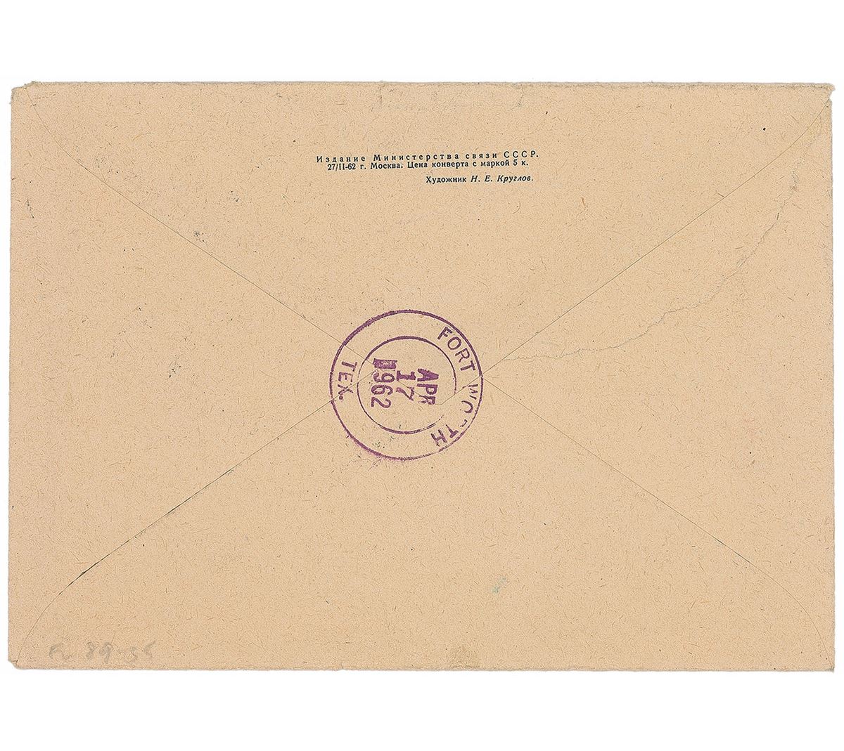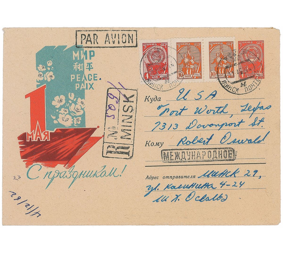 Hand-addressed May Day pictorial airmail envelope, 6.25 x 4.5, addressed by Oswald to his brother, “U.S.A., Fort Worth, Texas, 7313 Davenport St., Robert Oswald,” adding his own return address in Cyrillic [translated], “Minsk 29, ul. Kalinina, House 4-24, L. H. Oswald.” Reverse bears a postmark of Fort Worth, April 17, 1962. In fine condition. This envelope was part of Warren Commission Exhibit No. 317 and was previously held in the collection of Dr. John K. Lattimer, who examined medical evidence and performed ballistic tests for the investigation. Accompanied by a photocopy of the letter originally enclosed.