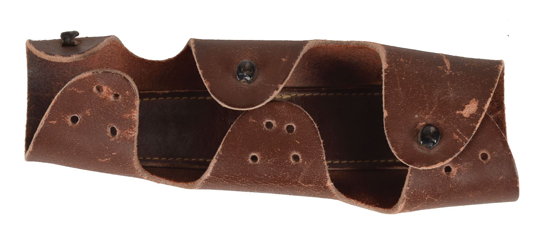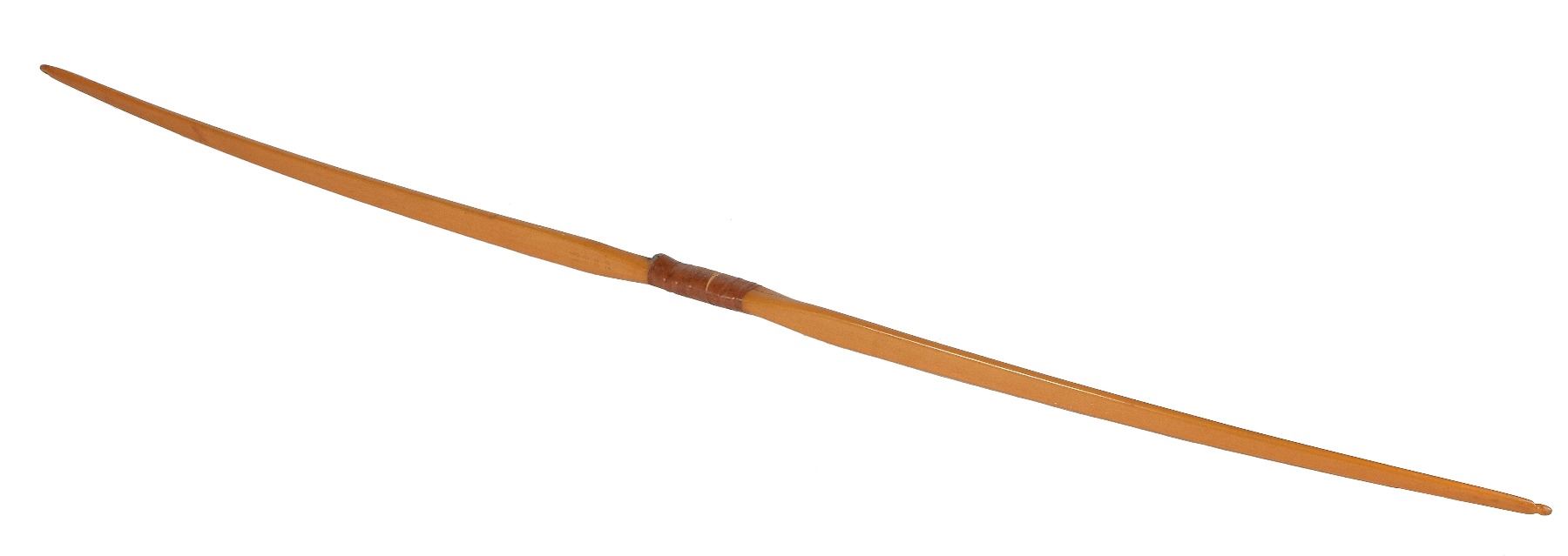 Lee Harvey Oswald's personally-owned and -used wooden bow and leather arm guard, purchased in New Orleans when he was 16 years old. The wooden bow measures 68? long and pulls 36 pounds at a draw length of 28 inches; these numbers are stamped on the front of the bow opposite the belly. The string is absent. Oswald's personally-worn leather arm guard was worn on his forearm to prevent the stroke of the bowstring from doing damage; the piece measures approximately 5 x 6.25?, and the tying strings are not present. In fine condition, with expected wear from use, most notably at the taped belly of the bow.