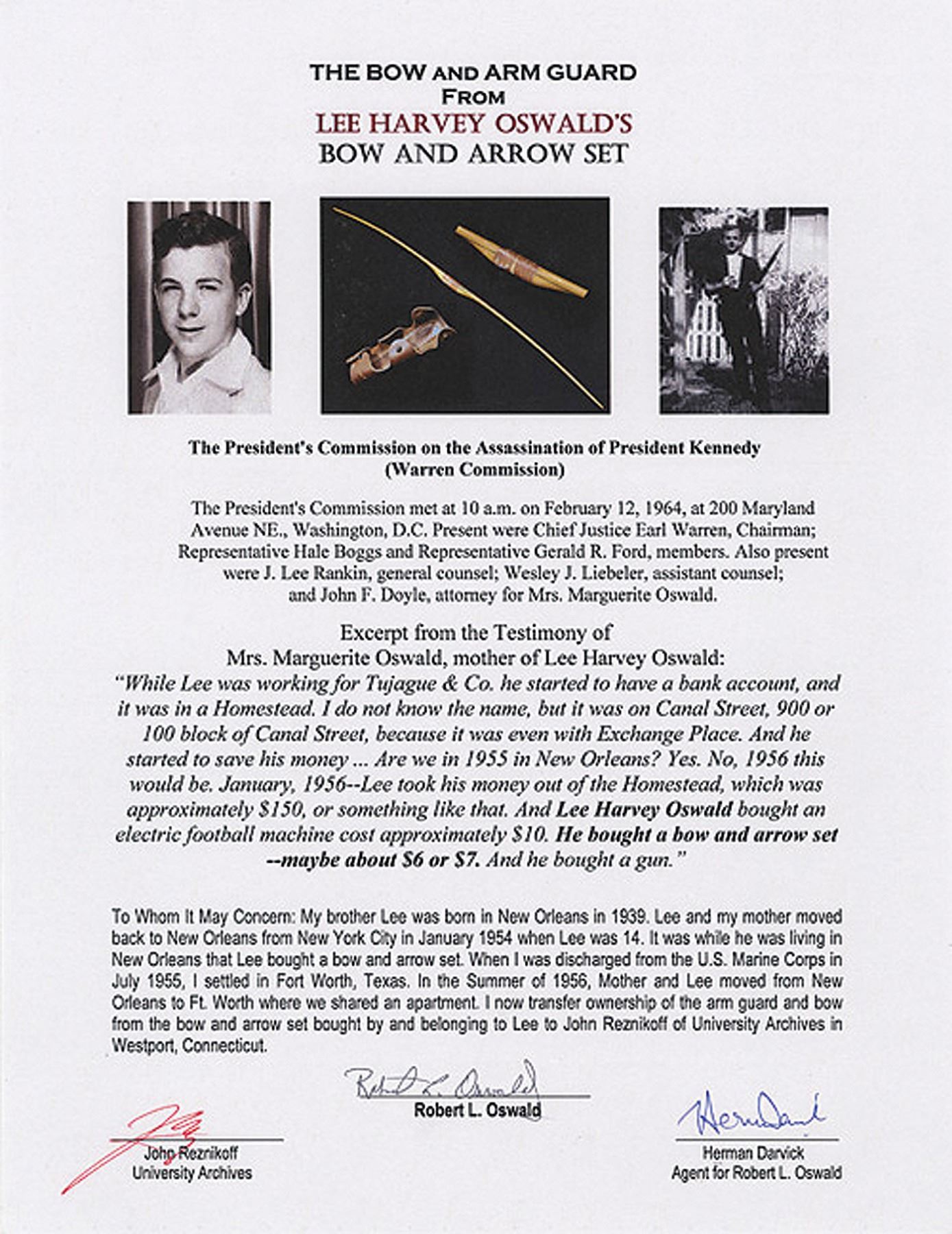 This bow was mentioned by Oswald's mother, Marguerite, in her testimony before the Warren Commission: 'While Lee was working for Tujague & Co. he started to have a bank account, and it was in a Homestead. I do not know the name, but it was on Canal Street, 900 or 100 block of Canal Street, because it was even with Exchange Place. And he started to save his money…January, 1956—Lee took his money out of the Homestead, which was approximately $150, or something like that. And Lee Harvey Oswald bought an electric football machine cost approximately $10. He bought a bow and arrow set—maybe about $6 or $7. And he bought a gun. Now, I don't know about guns. I was going to say BB gun, but I will not say it was a BB gun—but Robert Oswald will know—or a rifle. But it was not an expensive gun. He was just 16 1/2 years old. And I am of the opinion if he bought a real gun, I would have had to sign or something. I may be wrong. But anyhow it was a gun to go squirrel hunting or rabbit hunting.' Accompanied by a signed letter of provenance from his older brother, Robert L. Oswald. Also includes a limited edition silver gelatin photo of Oswald's mug shot, printed by University Archives, numbered 21/50.