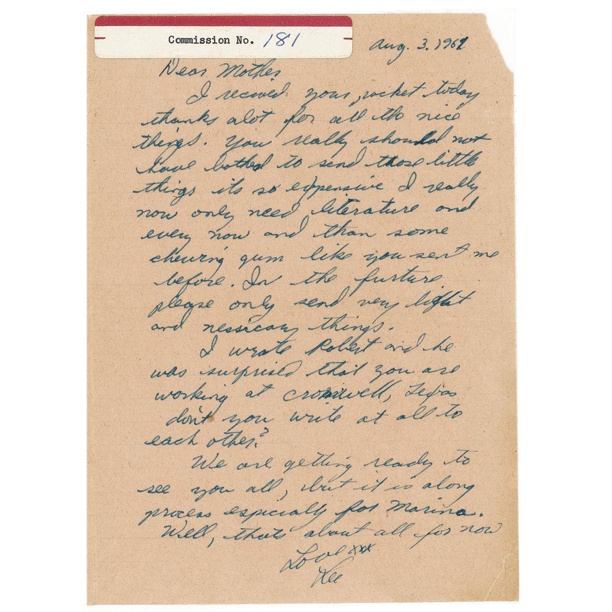 ALS signed “Love xxx Lee,” one page, lightly-lined, 6 x 8, August 3, 1961. Letter to his mother in Texas. In full (spelling and punctuation uncorrected): “I recived your packet today thanks alot for all the nice things. You really should not have botherd to send those little things its so expensive I really now only need literature and every now and than some chewing gum like you sent me before. In the future please only send very light and nessicary things. I wrote Robert [brother] and he was surprised that you are working at Cromwell, Texas don’t you write at all to each other? We are getting ready to see you all, but it is along process especially for Marina [wife]. Well, that’s about all for now.” This letter was an official exhibit (No. 181) in the Warren Commission investigation into JFK’s assassination and, like most of the exhibits, is protectively and permanently soft-laminated. In fine condition, with scattered light creasing and wrinkling, and missing a corner tip to each page.