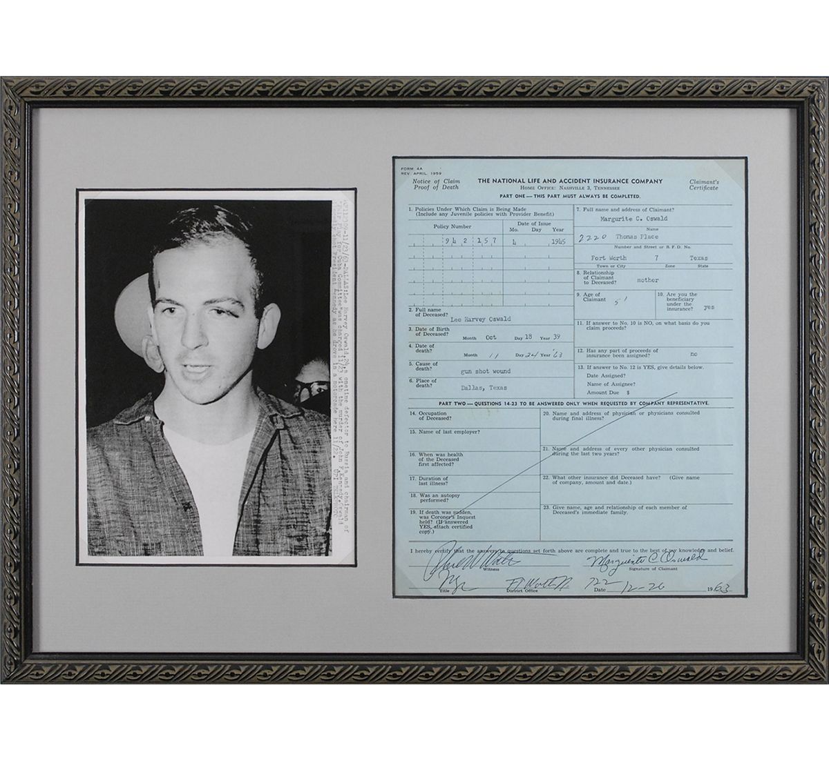 Original Notice of Insurance Claim/Proof of Death Certificate, signed at the conclusion by Oswald’s mother, issued by the National Life and Accident Insurance Company of Nashville, Tennessee, one page, 8.5 x 11, dated December 26, 1963. Entries have been in most cases typed, specifying the name of the deceased, “Lee Harvey Oswald,” dates birth and death, place of death, “Dallas,” and cause of death “gunshot wound.” Matted and framed with an original glossy UPI press photo of Oswald taken on the day of Kennedy’s assassination. In fine condition. The insurance company honored its obligations paying Mrs. Oswald $863.00 several months later, after execution of the document.