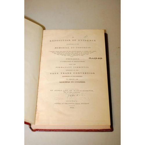 Lee, Henry. An Exposition of Evidence in Support of the Memorial to Congress Setting Forth the Evils of the Existing Tariff of Duties. Boston: Printed at the Boston Press, 1832. 8vo - over 7¾" - 9¾" tall. Hard Cover. Ex-Library. Good ++ Condition. COMMERCE. Title continues: and Asking Such a Modification of the Same, as Shall be Consistent with the Purpose of Revenue, and Equal in its Operation on the Different Parts of the United States, and on the Various Interests of the Same. Prepared in Pursuance of Instructions from the Permanent Committee Appointed by the Free Trade Commission Assembled at Philadelphia to Prepare the Memorial to Congress. Includes No. 4 Woolens and Iron, No. 5 Sugar, No. 6 Inquiry Into the Fall of Prices, No. 7 Taxes on Ships, No.8 Effects of the Anti-Commercial System, No. 9 & 10 Anti-Commercial System, No. 11 High Duty System. Bound as 1 in a library binding, occasional light water mark not affecting the text. Binding & hinges tight.