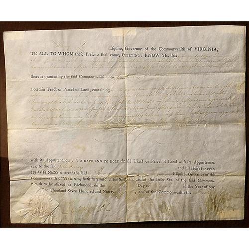 <Our item number 136805><B>Lee, Henry.</B> (1756-1818) Revolutionary War officer known as "Light Horse Harry", Governor of Virginia (1791-94), U.S. congressman, and father of Robert E. Lee. Document signed as Governor of Virginia, 1p, vellum, 12 x 14¼ in., Richmond, 15 March 1794. Granting 1250 acres of land in Norfolk County to John Kearney. Very good; translucence to vellum causes the first name in the signature to be very light; "Lee" is somewhat darker. Matted and framed to an overall size of 21 x 23 in.; numerous nicks to frame. <BR>Estimated Value $250 - 300. <BR><BR>Our item number 136805<BR><IMAGES><P ALIGN="CENTER"><IMG SRC="http://www.goldbergcoins.net/liveauction/49jpegs/136805.jpg"> </P></IMAGES>