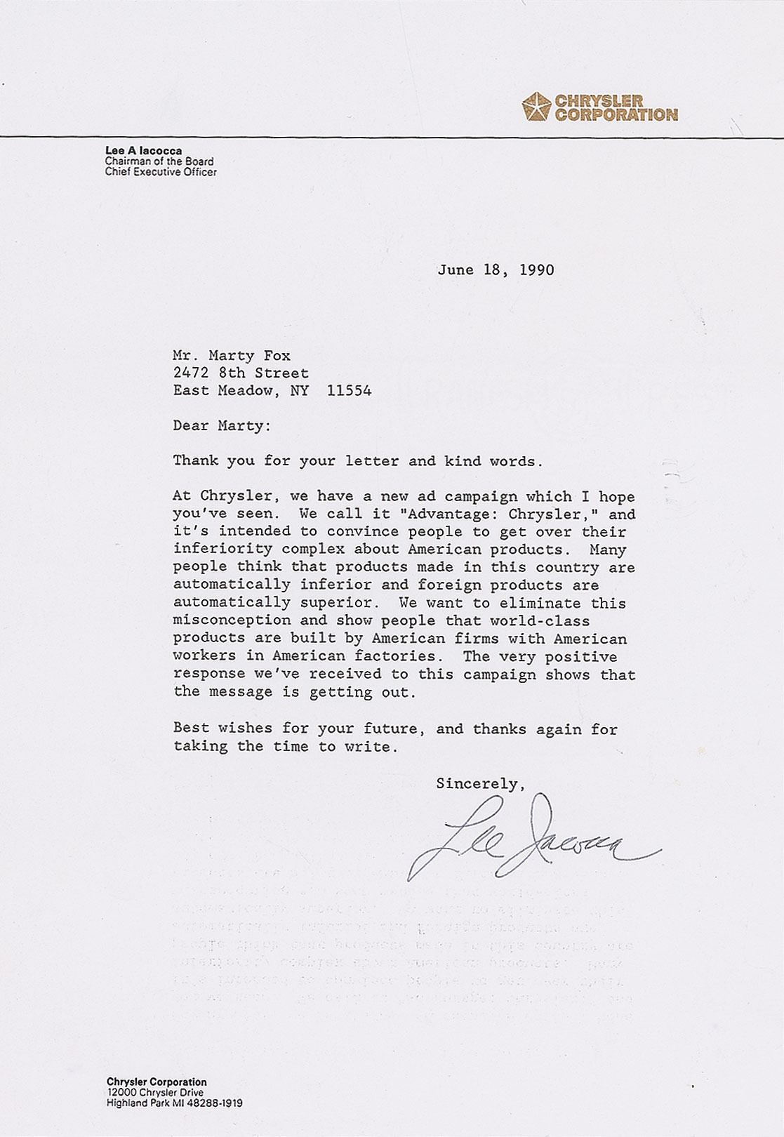 TLS, one page, 7.25 x 10.5, Chrysler Corporation letterhead, June 18, 1990. Letter about Chrysler's quality, in part: "At Chrysler, we have a new ad campaign which I hope you've seen. We call it 'Advantage: Chrysler,' and it's intended to convince people to get over their inferiority complex about American products. Many people think that products made in this country are automatically inferior and foreign products are automatically superior. We want to eliminate this misconception and show people that world-class products are built by American firms with American workers in American factories. The very positive response we've received to this campaign shows that the message is getting out." In fine condition. Accompanied by the original mailing envelope.