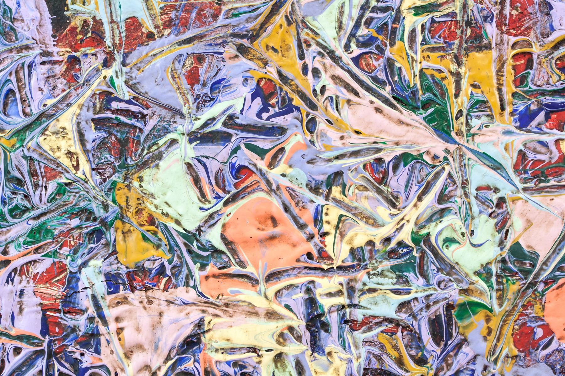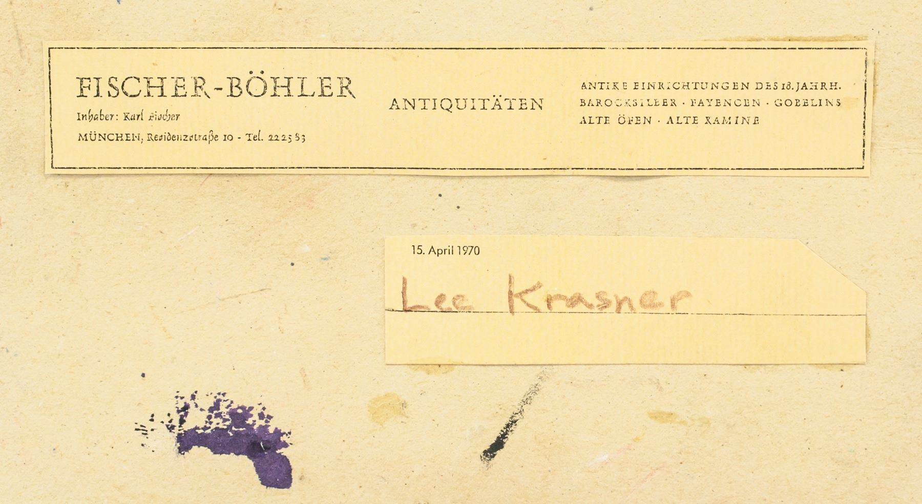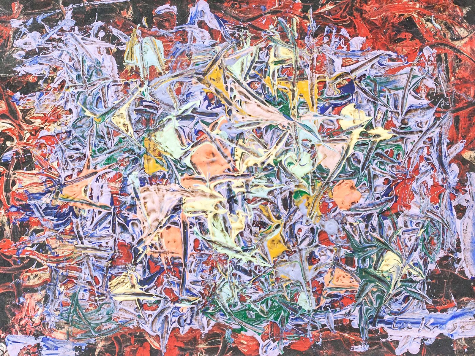 Mixed media on board. Featuring abstract composition. Signed "Lee Krasner" in the bottom right corner. Stamped "TO Louis Berger PARIS" on verso. Labels on verso read "FISCHER-BOHLER ANTIQUITATEN" and "Lee Krasner 15 April 1970". Attributed to Lee Krasner (1908-1984, American). 32 x 42 cm (12.5 x 16.5 inches).