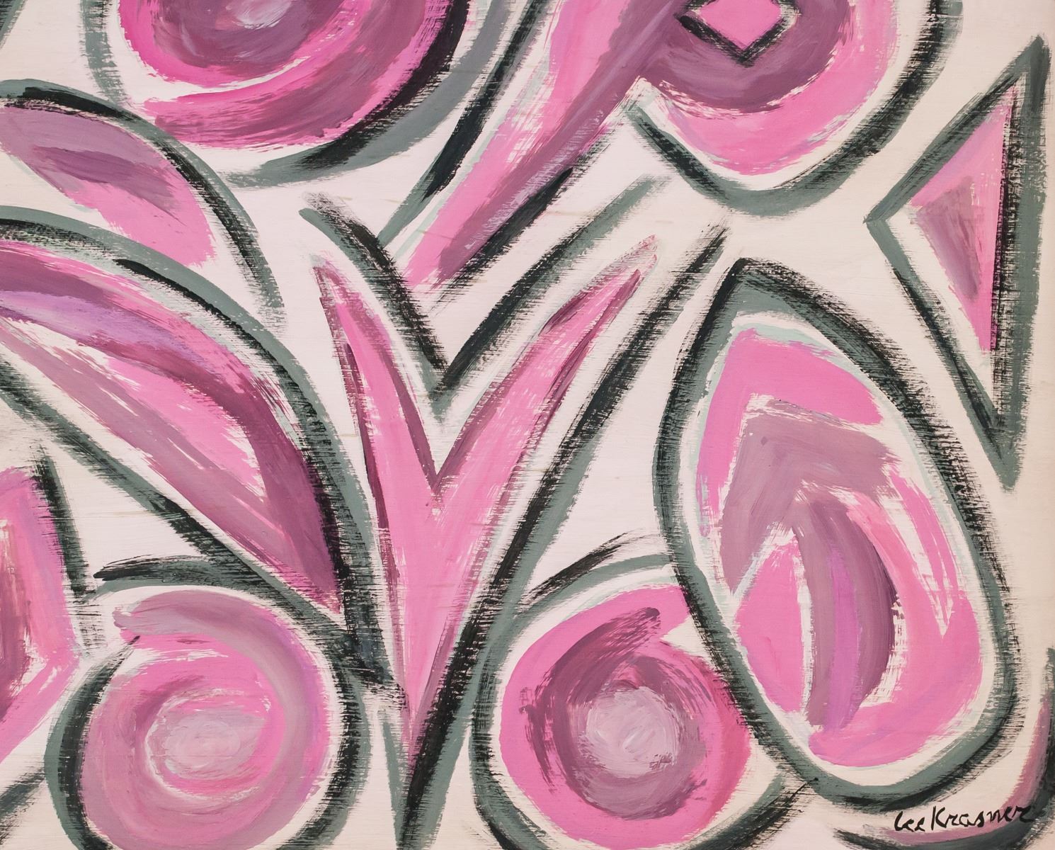 Oil on canvas, framed. Featuring an abstract expressionist composition. Signed Lee Krasner on the lower right corner. Attributed to Lee Krasner (1908-1984, American). 40.5 x 47.5 cm (15.75 x 18.75 inches). Framed size: 51 x 58.5 cm (20 x 23 inches). PROVENANCE: This lot carries limited provenance from a Southern Ontario estate