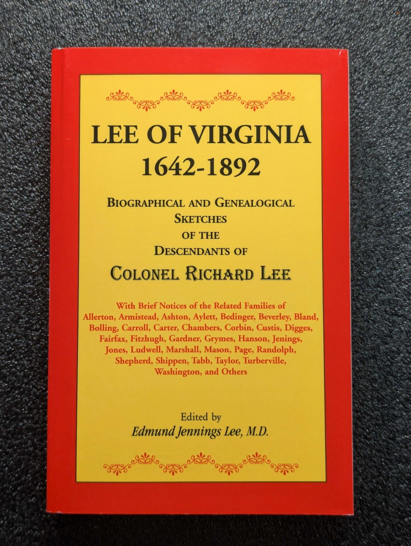 Lee, Edmund Jennings, M.D. [editor]. LEE OF VIRGINIA 1642-1892 - BIOGRAPHICAL AND GENEALOGICAL SKETCHES OF THE DECENDANTS OF COLONEL RICHARD LEE. Heritage Books, Inc., Westminster. 2019. 12mo. (2), 586, (4) pages. original pictorial card covers. Frontispiece family crest. Appendix. B&w photos and illustrations. English text. The David Baker Library. Fine. The Lee family is composed of perhaps the most distinguished ancestry on record, having provided, for example, greater numbers of Revolutionary and Civil War generals and officers, politicians, and statesmen than any family of comparable size and standing. Lot weight: 1 lbs 13oz. Subject(s): American Biographical History.