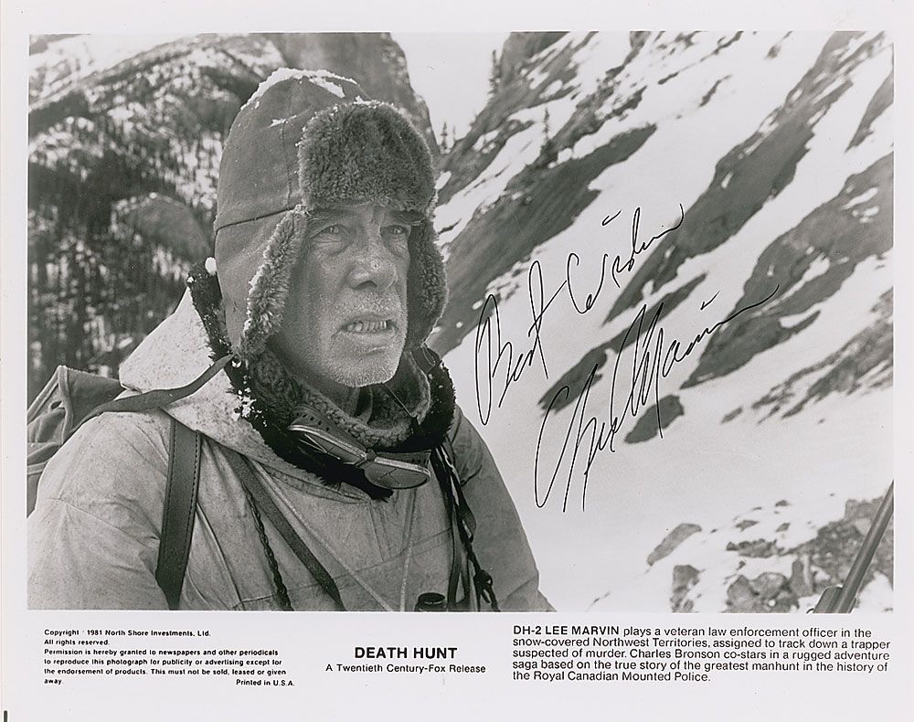 Glossy 10 x 8 20th Century Fox promotional photo for Death Hunt, signed in black felt tip, “Best wishes, Lee Marvin.” In fine condition.