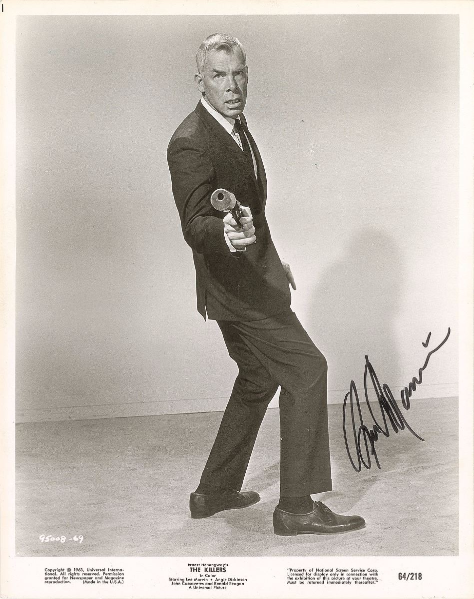 Glossy 8 x 10 Universal Pictures publicity photo of Marvin as hit-man Charlie Strom in the 1964 film The Killers, signed in black felt tip. Reverse bears an ownership stamp. In fine condition. From the Harvey and Rhoda Kuflik Collection. Pre-certified PSA/DNA.