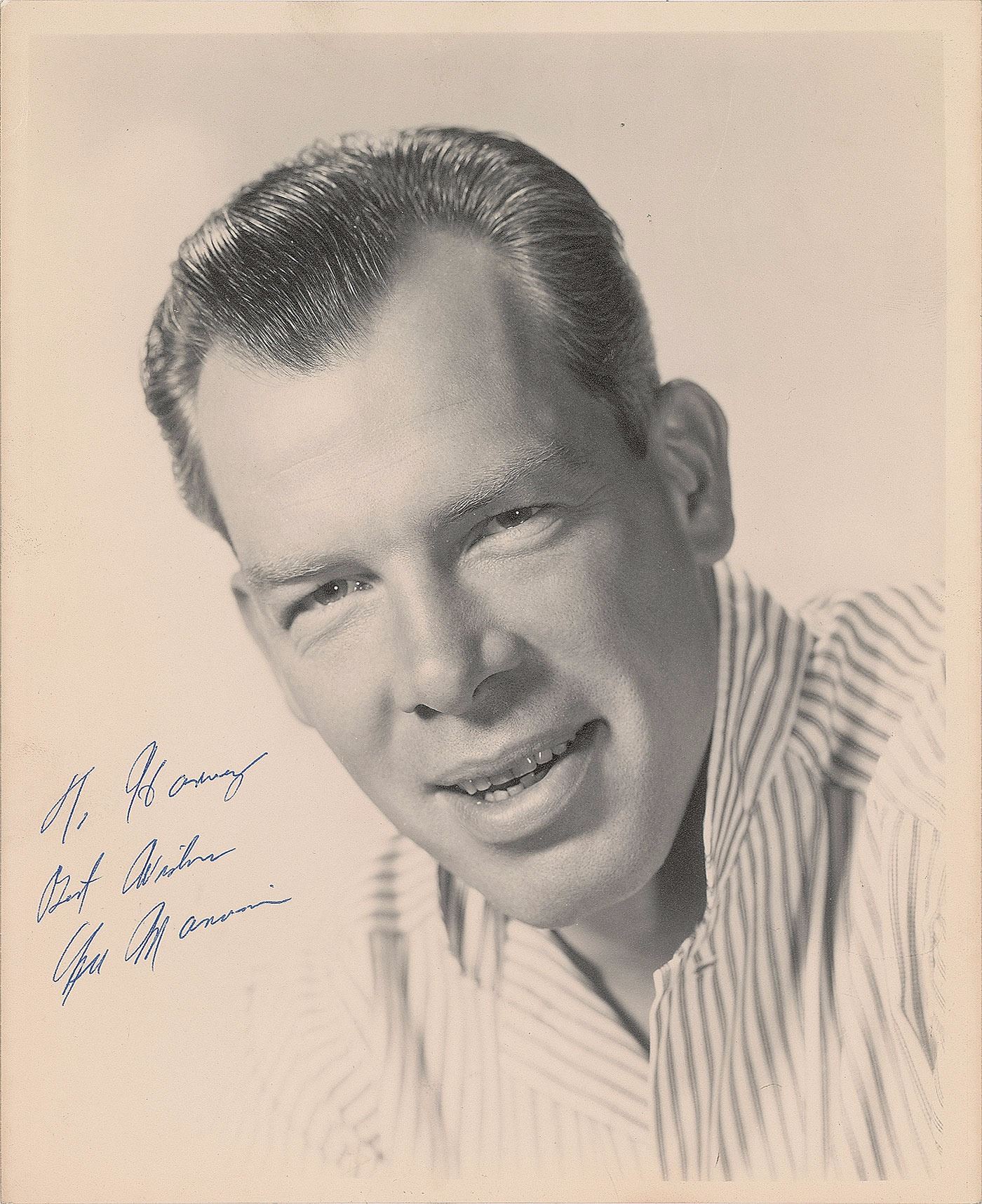 Matte-finish 8 x 9.75 studio portrait of Marvin wearing a striped collared shirt, signed and inscribed in black ballpoint, "To Harvey, Best Wishes, Lee Marvin.” In fine condition. From the Harvey and Rhoda Kuflik Collection.