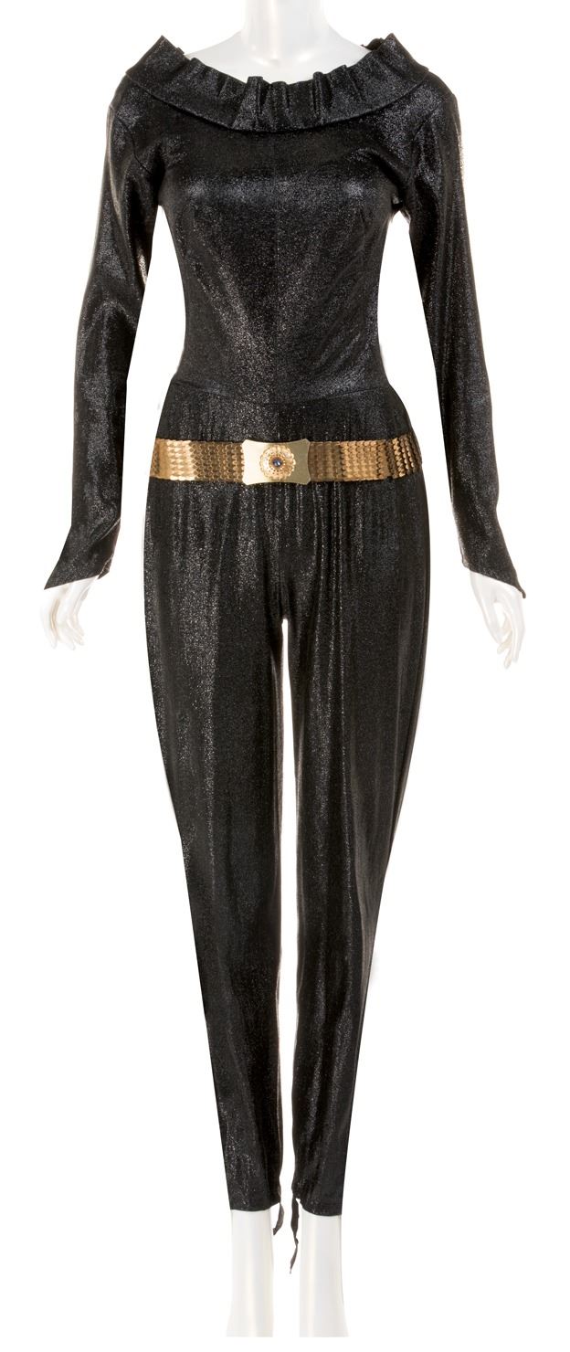 79. Lee Meriwether "Catwoman" suit and belt from Batman: The Movie. (TCF, 1966) Vintage original black stretchy lurex bodysuit with standing boat neck collar, darted waistline, tapered cuffs, integral hooks for attaching belt (included), self stirrups, internal web strap at waist, and ruched zipper back closure. Retaining internal TCF and Berman's bias labels. Including stretchy golden fish scale belt with golden buckle with blue crystal. Exhibiting production wear age, soiling, 1-stirrup has split. In vintage very good condition. Provenance: Profiles in History, Auction 36, April 30-May 1, 2009, Lot 827. $6,000 - $8,000