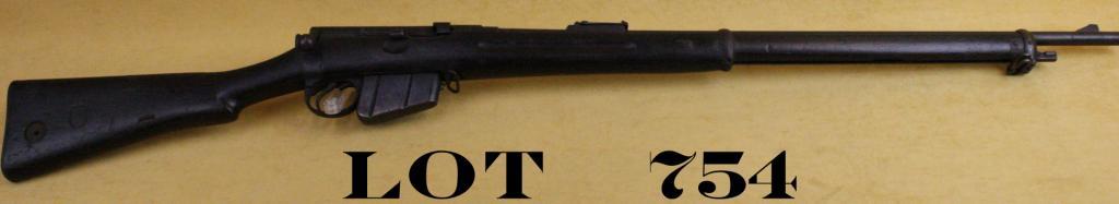 Lee-Metford Mark I* bolt-action rifle by BSA (receiver dated 1890), .303 cal., 30” round barrel, military finish, missing cleaning rod, wood stock, #1372. This gun is in overall uncleaned, untouched out-of-the-attic fair to good condition showing considerable military finish with areas of erosion and some blood pitting on the barrel at the breech area, fair bore with strong rifling, good action and lots of proof marks on frameand barrel at breech; wood shows numerous dings and mars from carry and years of storage, missing brass inset disc on right side of butt stock; a little TLC will greatly improve the appearance of this oldworkhorse. Est.: $250-$450.