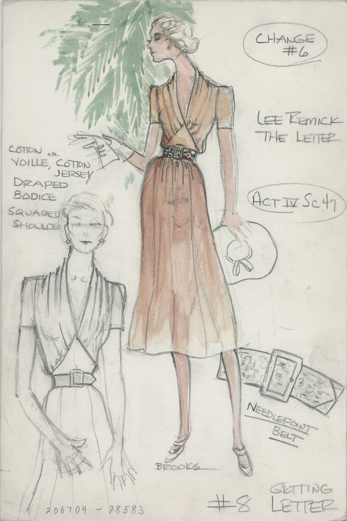 178. Lee Remick "Leslie Crosbie" costume sketch by Donald Brooks for The Letter.(Warner Bros.TV, 1982) Vintage original sketch accomplished in pencil and gouache on 10 x 15 in. artists board, with additional pencil detail sketch and notation in the borders. Signed by the artist beneath the artwork. In vintage good condition. This lot is from the estate of Dwight Richard Odle (1941-2018). Proceeds will go to the St. Jude's Memorial Foundation. $200 - $300