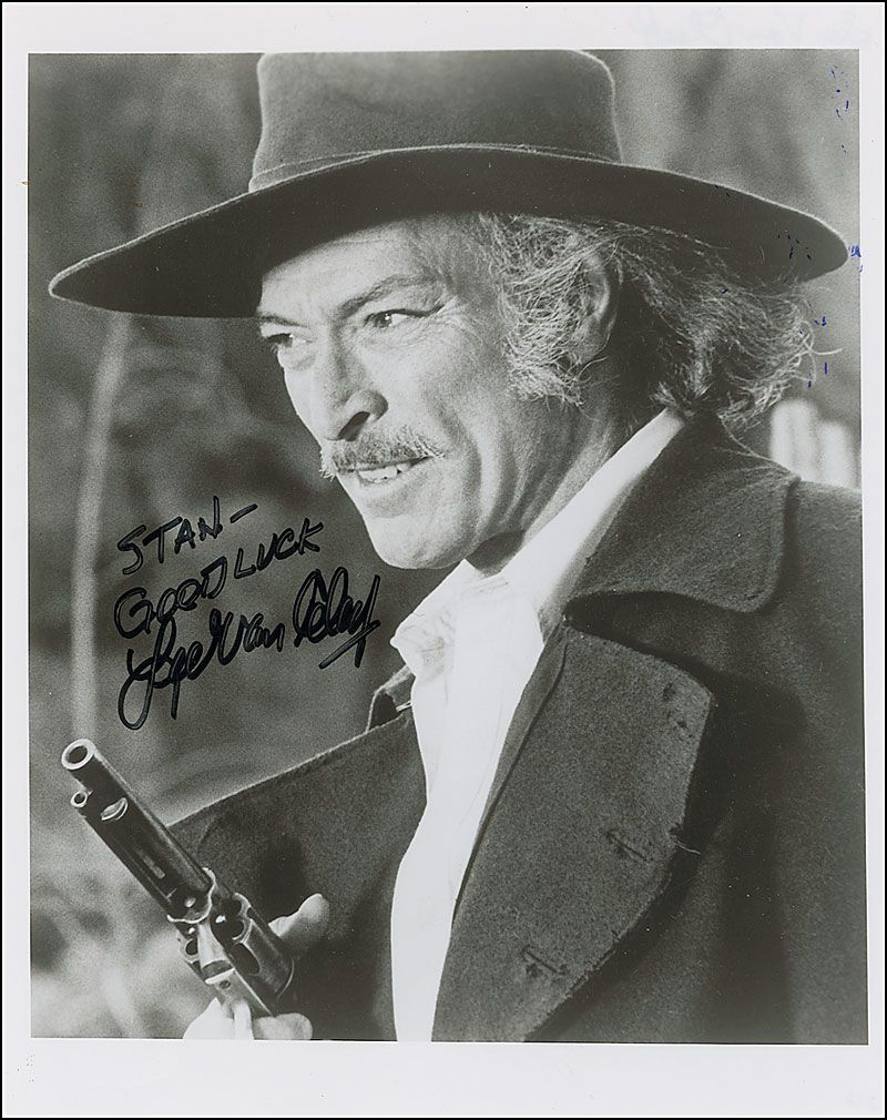 Glossy 8 x 10 photo of Van Cleef holding a revolver, signed and inscribed in black felt tip, “Stan—Good luck, Lee Van Cleef.” In fine condition, with some stray ink marks to the upper right and a JSA label affixed to the reverse. Accompanied by a certificate of authenticity from JSA.