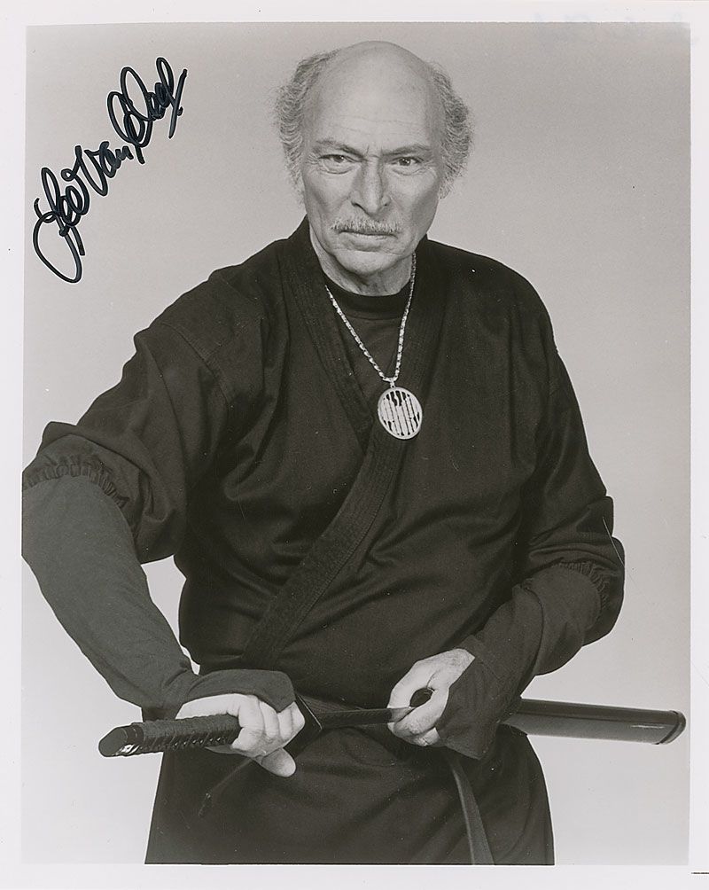 Glossy 8 x 10 photo of Van Cleef drawing a sword, signed in black felt tip. In fine condition, with a JSA label affixed to the reverse. Accompanied by a certificate of authenticity from JSA.