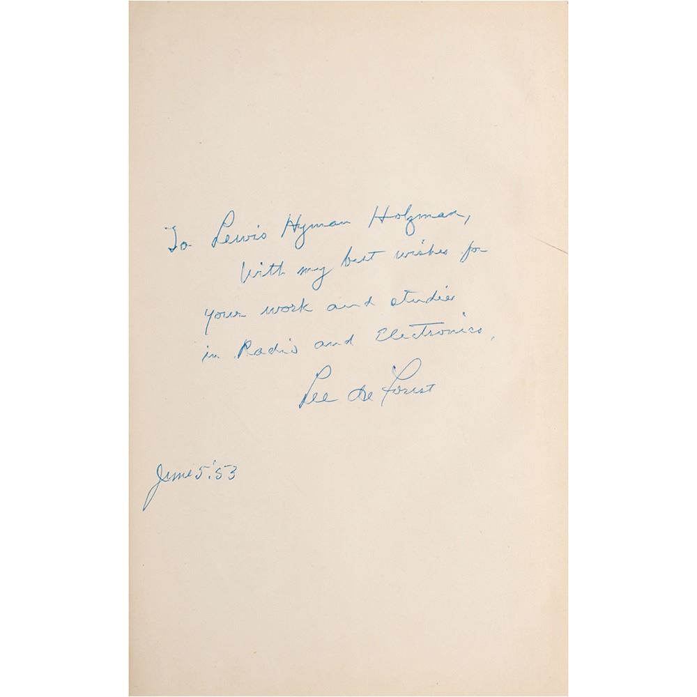 Signed book: Father of Radio: The Autobiography of Lee de Forest. First edition. Chicago: Wilcox & Follett Co., 1950. Hardcover, 6 x 9.25, 502 pages. Signed and inscribed on the first free end page in blue ballpoint, "To Lewis Hyman Holzman, With my best wishes for your work and studies in Radio and Electronics, Lee de Forest, June 5, '53." In very good condition, with cracked hinges, some scattered staining, and scuffing and minor losses to boards and spine.