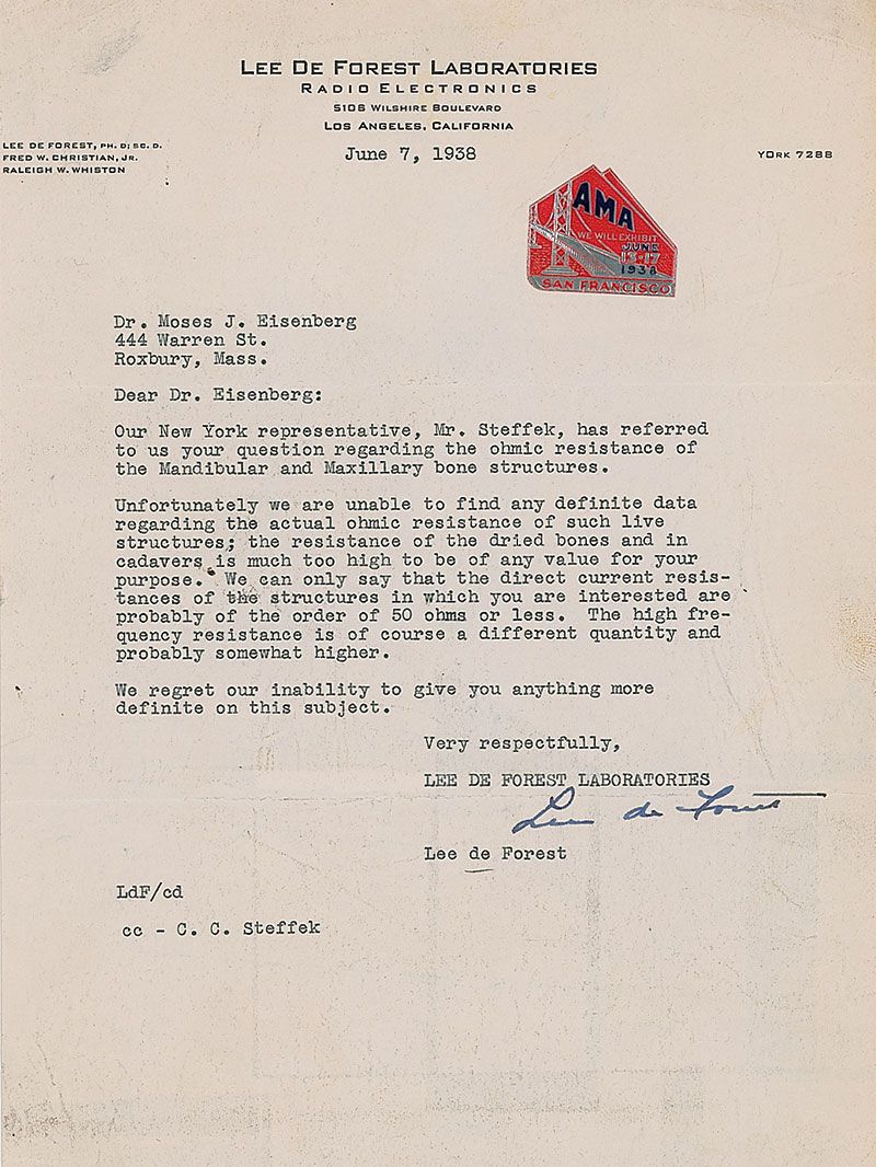 Prolific American inventor (1873–1961) often referred to as ‘the father of radio’ for his pioneering work in wireless telegraphy. TLS, one page, 8 x 10.5, Lee de Forest Laboratories letterhead, June 7, 1938. Letter to Dr. Moses Eisenberg. In part: “We are unable to find any definitive data regarding the actual ohmic resistance of such live structures; the resistance of the dried bones and in cadavers is much too high to be of any value for your purpose. We can only say that the direct current resistance of the structures in which you are interested are probably of the order of 50 ohms or less. The high frequency resistance is of course a different quantity and probably somewhat higher.” An AMA exhibition stamp is affixed near the top, and letter is affixed to an identical size sheet of cardstock. In fine condition, with scattered wrinkles and creases, and a bit of light soiling.