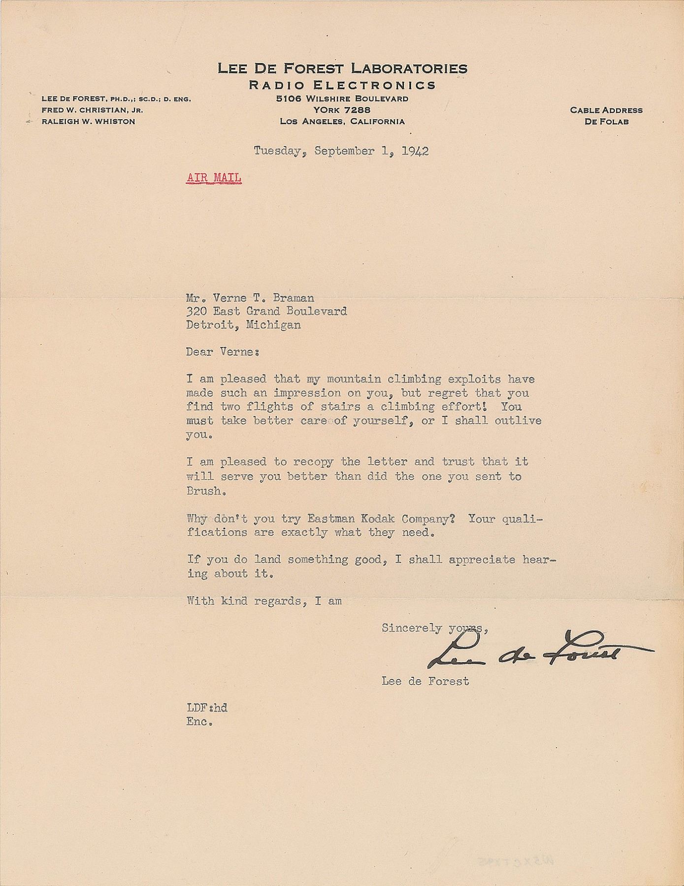 Prolific American inventor (1873–1961) often referred to as 'the father of radio' for his pioneering work in wireless telegraphy. TLS, one page, 8.5 x 11, Lee De Forest Laboratories letterhead, September 1, 1942. Letter to Verne T. Braman, in part: "I am pleased that my mountain climbing exploits have made such an impression on you, but regret that you find two flights of stairs a climbing effort! You must take better care of yourself, or I shall outlive you…Why don't you try the Eastman Kodak Company? Your qualifications are exactly what they need." In fine condition.