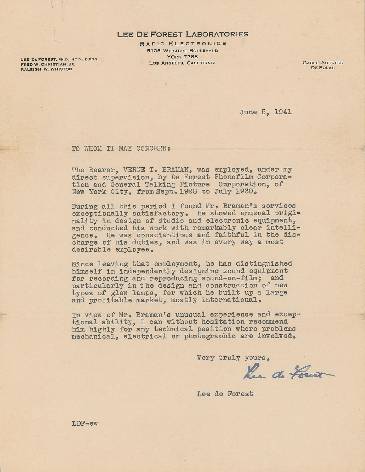 TLS, one page, 8.5 x 11, Lee De Forest Laboratories letterhead, June 5, 1941. A letter of recommendation for Verne T. Braman, who worked at De Forest Phonofilm and General Talking Picture from September 1928 to July 1930, in part: "He showed unusual originality in design of studio and electronic equipment, and conducted his work with remarkably clear intelligence. He was conscientious and faithful in the discharge of his duties, and was in every way a most desirable employee. Since leaving that employment, he has distinguished himself in independently designing sound equipment for recording and reproducing sound-on-film; and particularly in the design and construction of new types of glow lamps, for which he built up a large and profitable market, mostly international." In fine condition.