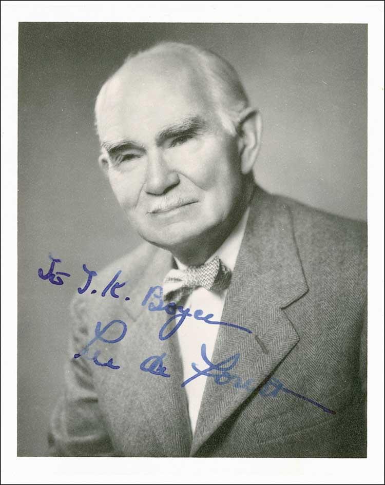 Prolific American inventor (1873–1961) often referred to as “the father of radio” for his pioneering work in wireless telegraphy. Vintage matte-finish 3.75 x 4.5 photo of de Forest in a jacket and bow tie, signed and inscribed in fountain pen “To T. K. Boyce, Lee de Forest.” In fine condition. RRAuction COA.