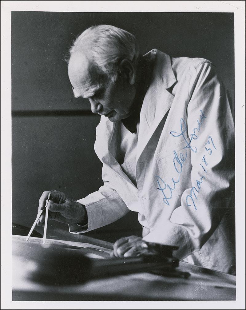 Vintage glossy 4 x 5 photo of de Forest at work, signed in blue ballpoint, “Lee de Forest, Mar. 1857.” In very good condition, with paperclip impression to top edge, impressions from typed notations on reverse, a couple corner creases, and small spot to finish. Provenance: The Barry Hoffman Collection.