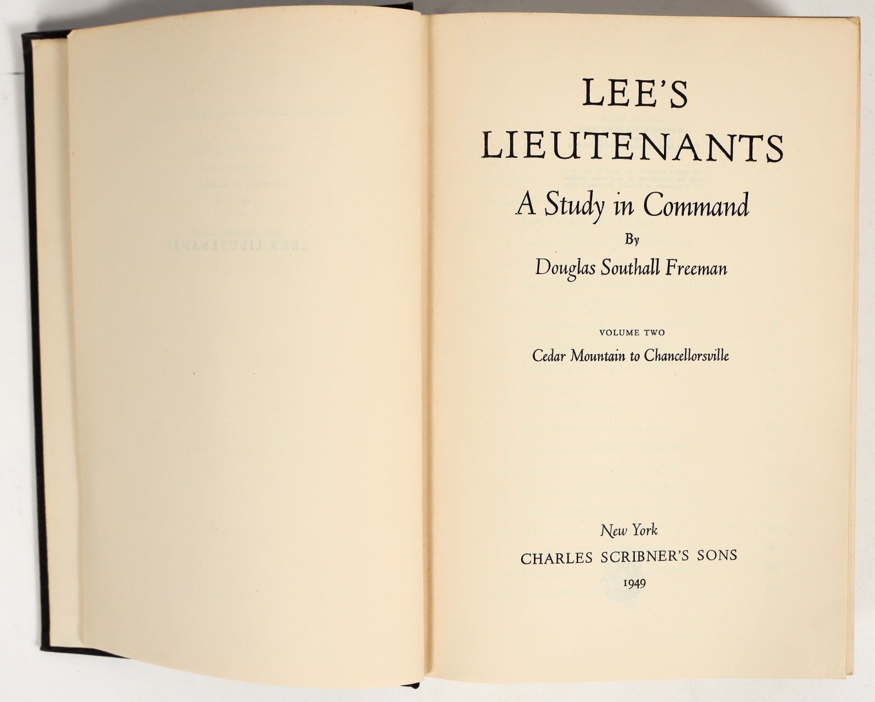 Likely second-edition copy of "Lee's Lieutenants: A Study in Command, Volume 2: Cedar Mountain to Chancellorsville" by Douglas Southall Freeman, originally published 1943, this edition dated 1949. Hardback, 760 pages, original black fabric binding w/ gilt lettering on spine and cover. Illustrated throughout with maps, some photographs. Good condition with some minor fading on spine. 6.5"x9.25"x1.75".