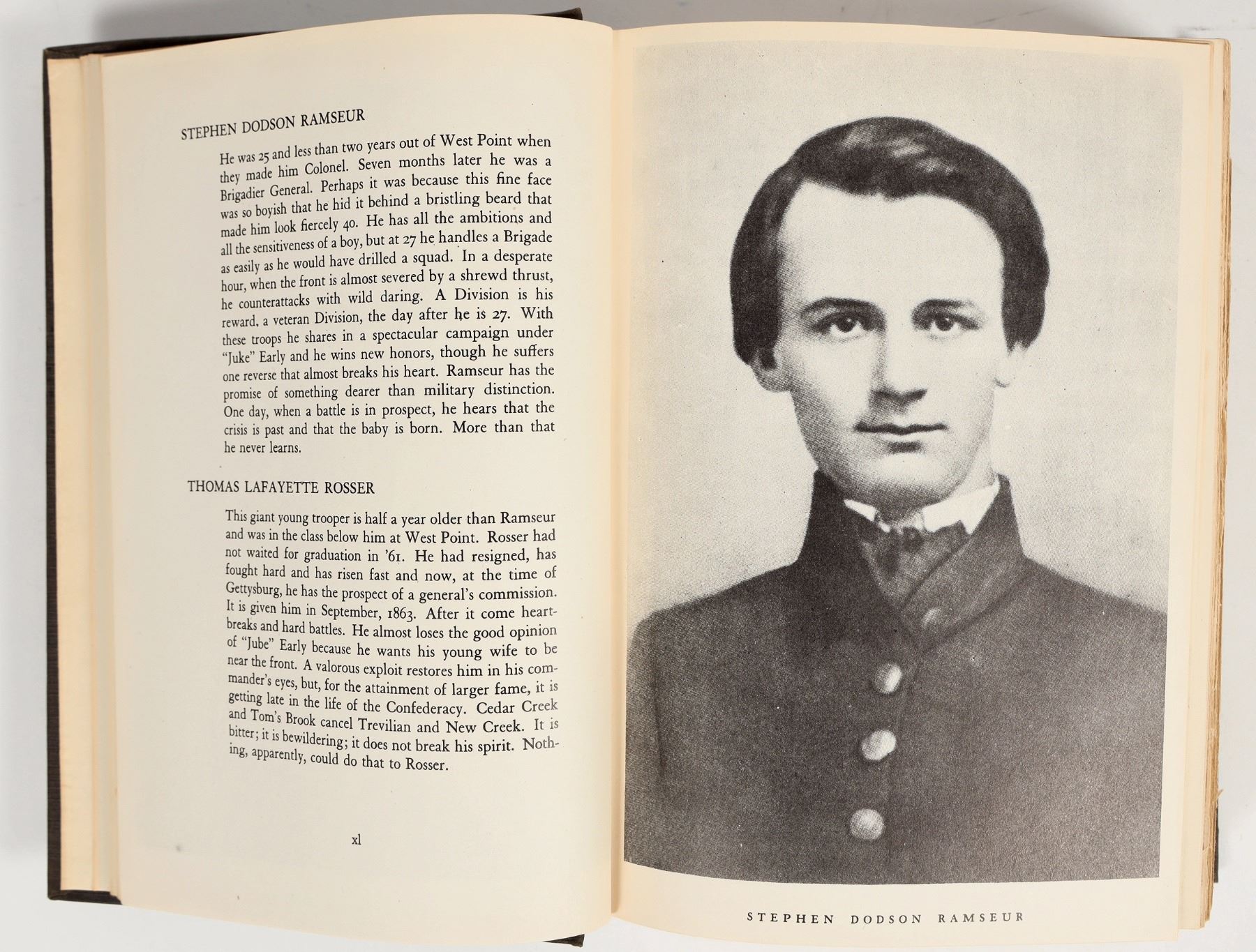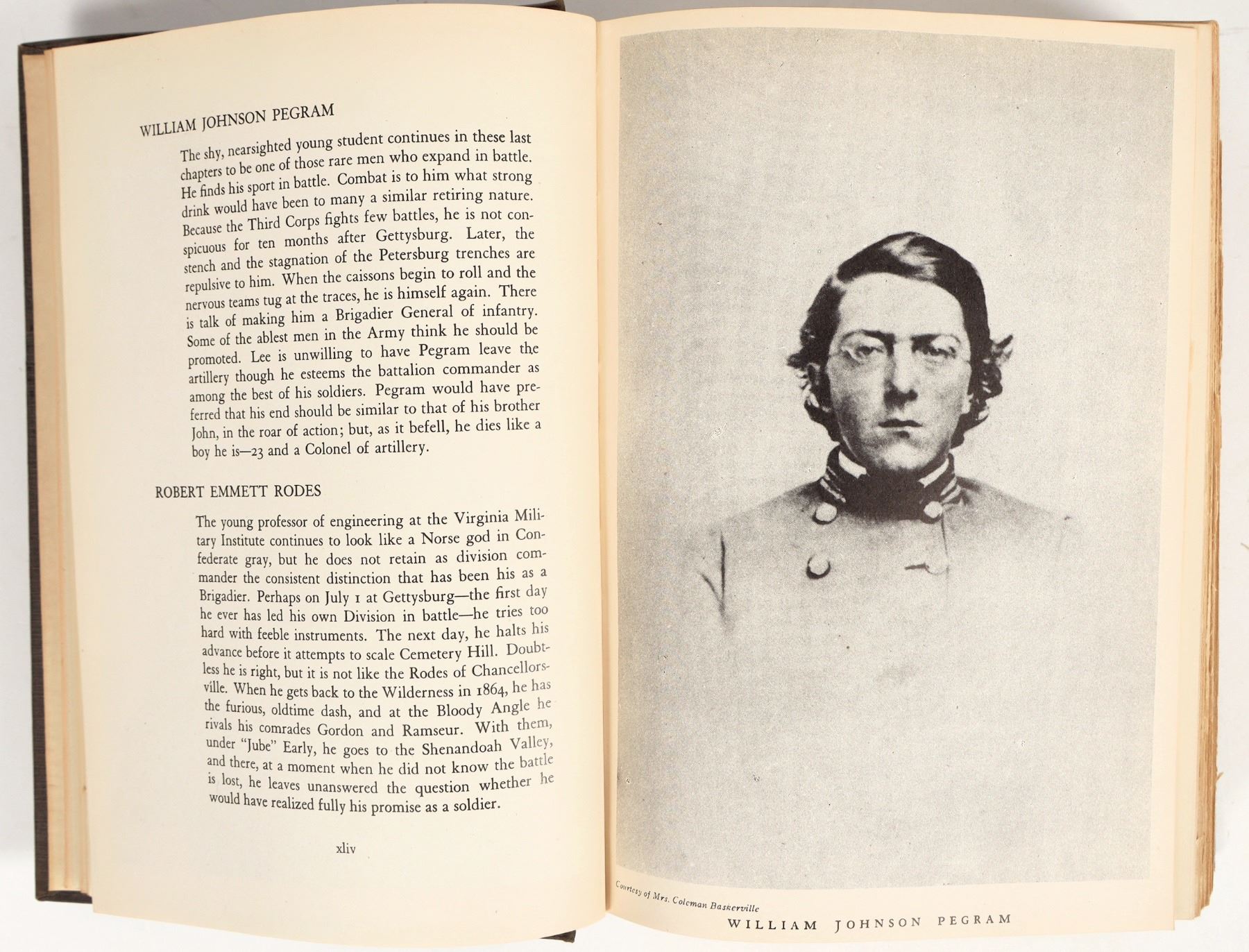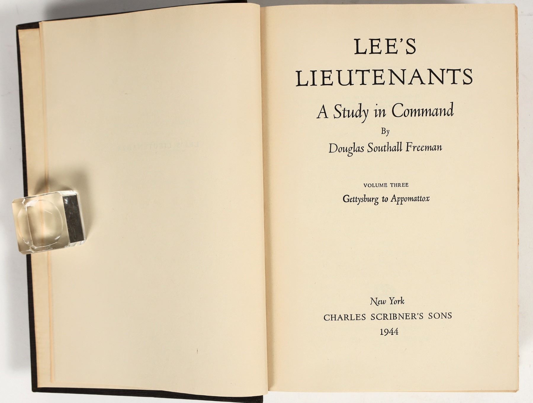 First-edition copy of "Lee's Lieutenants: A Study in Command, Volume 3: Gettysburg to Appomattox" by Douglas Southall Freeman, published 1944. Hardback, 862 pages, original black fabric binding w/ gilt lettering on spine and cover. Illustrated throughout with maps, fold-out map at rear. Great condition with some minor fading on spine, some light discoloration on cover. 6.5"x9.25"x2".