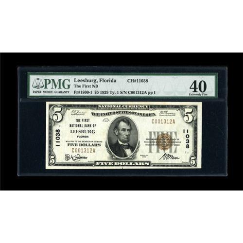 <B>Leesburg, FL</B></I> - $5 1929 Ty. 1 <B>The First NB</B></I> Ch. # 11038<BR> A new addition to the census, and an attractive note which is one of the higher grade examples known. Bright PMG <B>Extremely Fine 40.</B></I><BR><I>From The Sunshine State Collection.</B></I><BR><BR><b>Shipping:</b> Coins & Currency (<a target="_blank" href="http://www.heritageauctions.com/common/shipping.php">view shipping information</a>)