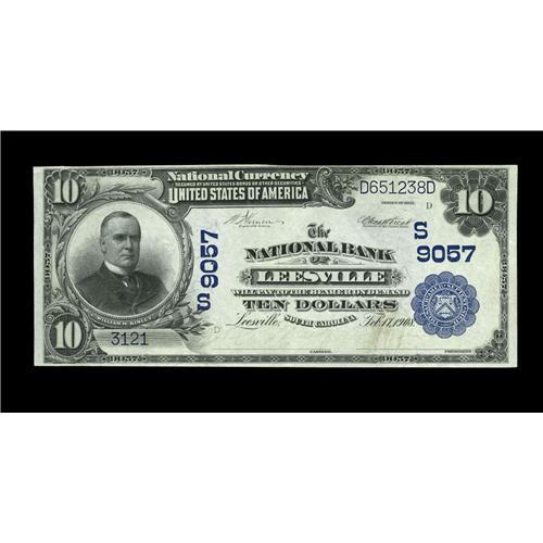 <B>Leesville, SC</B></I> - $10 1902 Plain Back Fr. 626 <B>The NB of Leesville</B></I> Ch. # (S)9057<BR>This is one of a small group of high grade examples which make up most of the large size census from this bank, the sole issuer in Leesville. Bright <B>About Uncirculated,</B></I> with a pair of pinholes mentioned for total cataloguing accuracy.